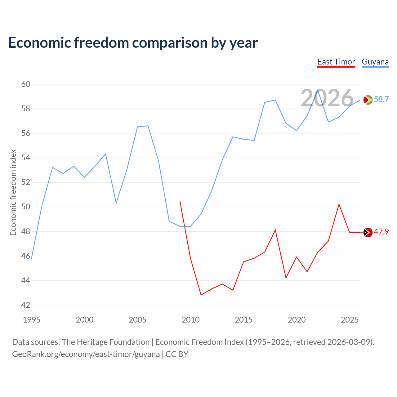 The Economic Freedom Index for East Timor is 47.9, ranking 173/197, compared to 58.7 for Guyana, ranking 109/197. The chart above displays a comparison of annual changes in economic freedom indexes.