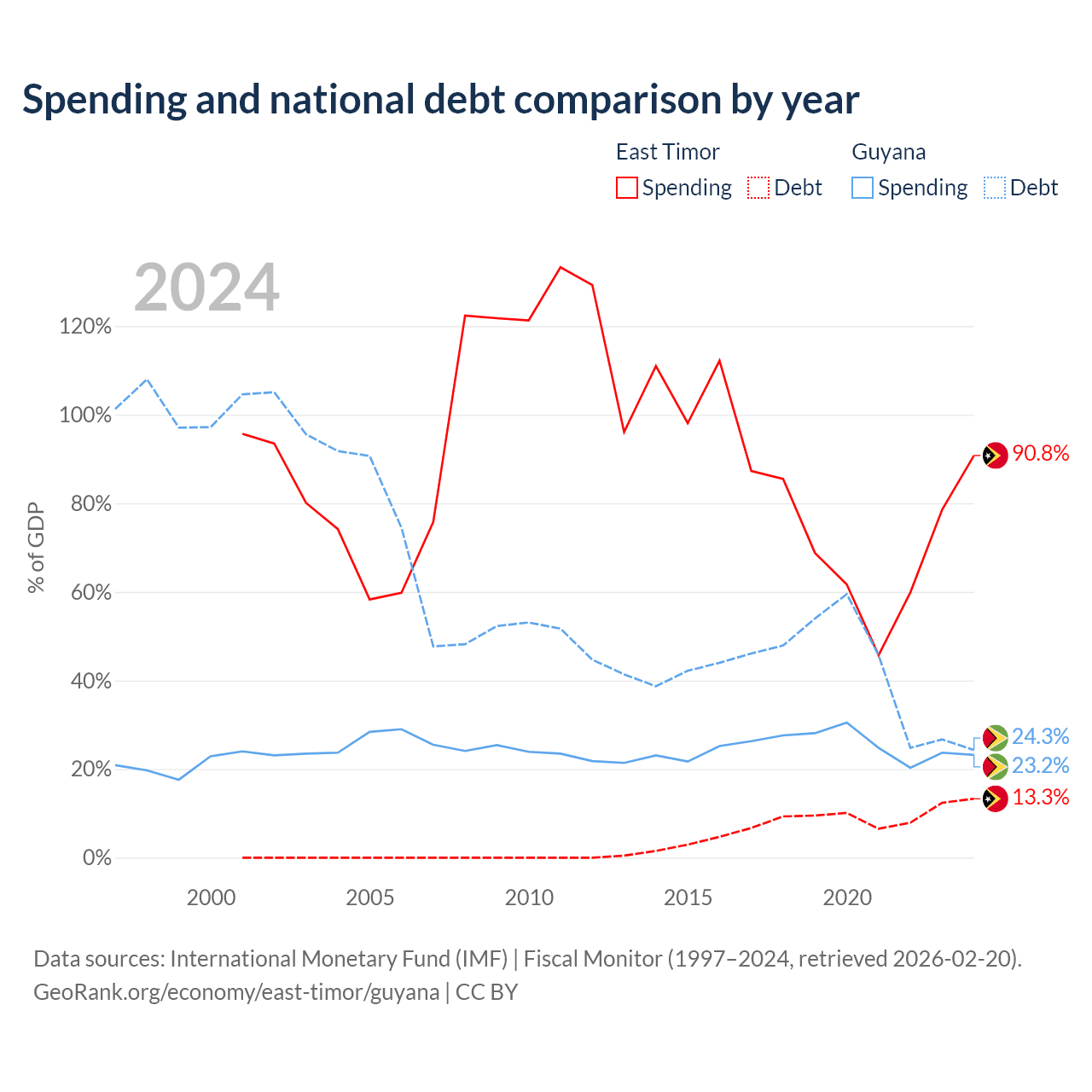 East Timor has $249M in government debt (13.3% of GDP), compared to $5.99B (24.3% of GDP) in Guyana.