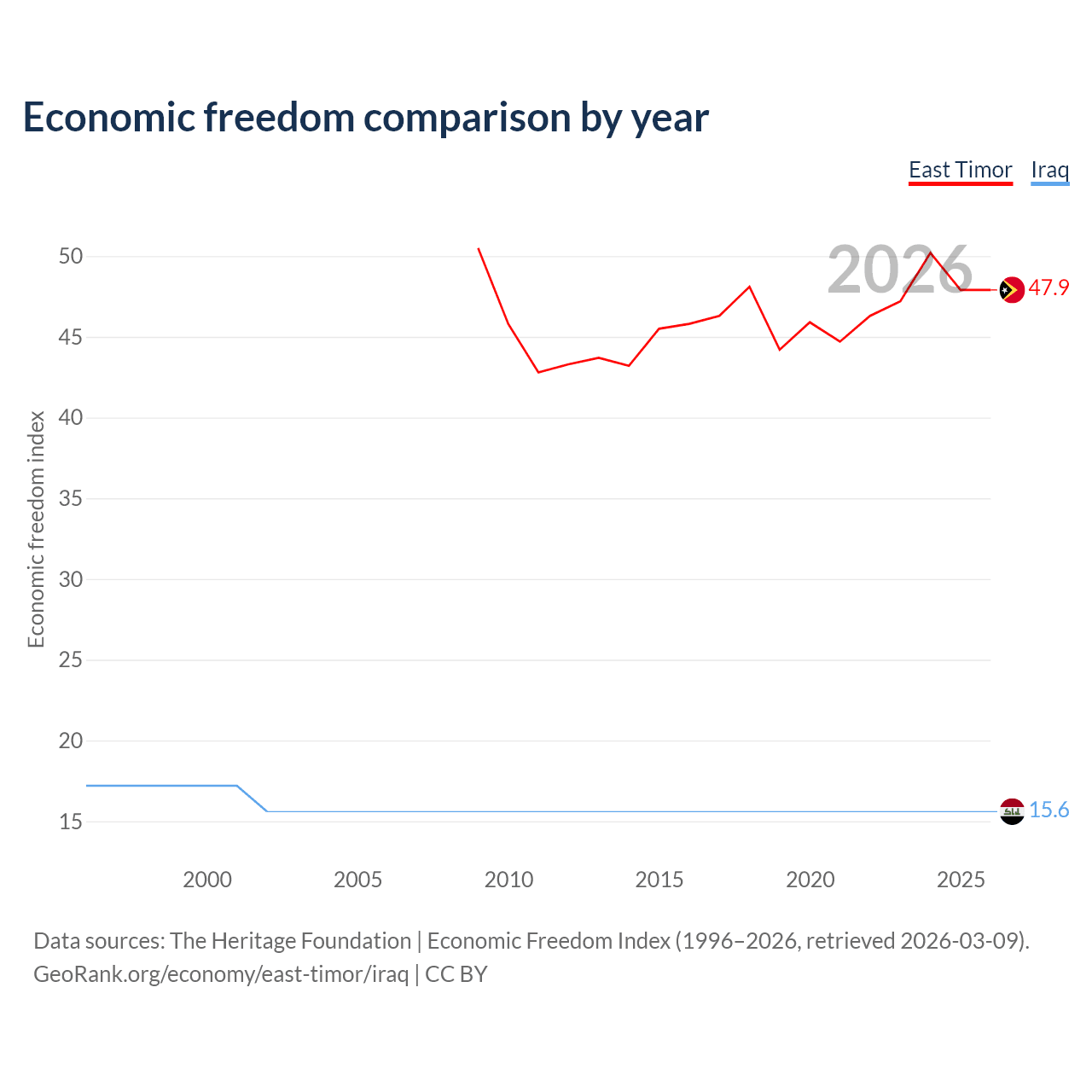The Economic Freedom Index for East Timor is 47.9, ranking 173/197, compared to 15.6 for Iraq, ranking 196/197. The chart above displays a comparison of annual changes in economic freedom indexes.