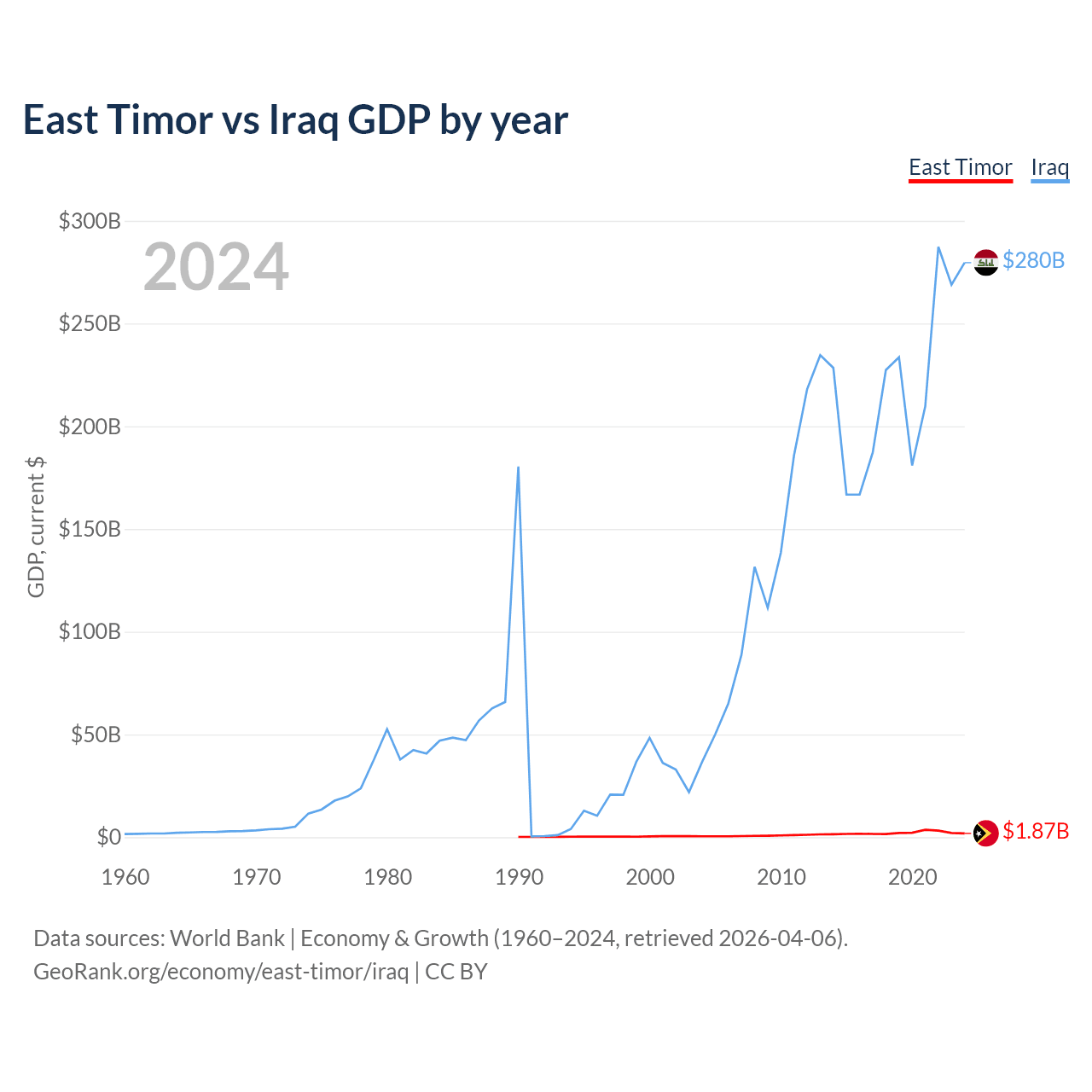 East Timor has a GDP of $1.87B compared to $280B for Iraq, ranking 181/197 and 50/197 by economy size, respectively.