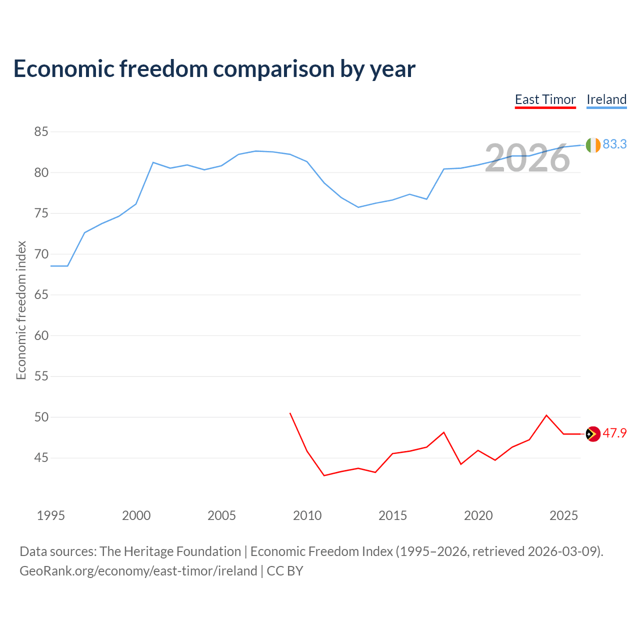 The Economic Freedom Index for East Timor is 47.9, ranking 173/197, compared to 83.3 for Ireland, ranking 3/197. The chart above displays a comparison of annual changes in economic freedom indexes.