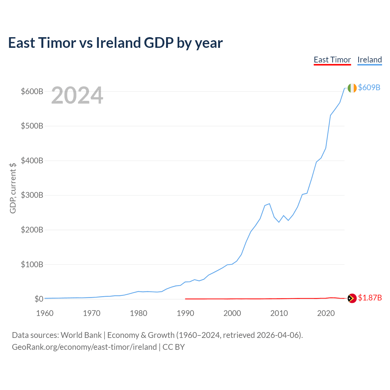 East Timor has a GDP of $1.87B compared to $609B for Ireland, ranking 181/197 and 25/197 by economy size, respectively.
