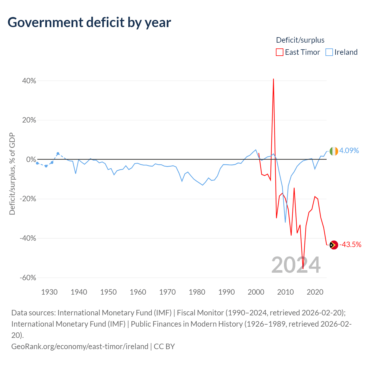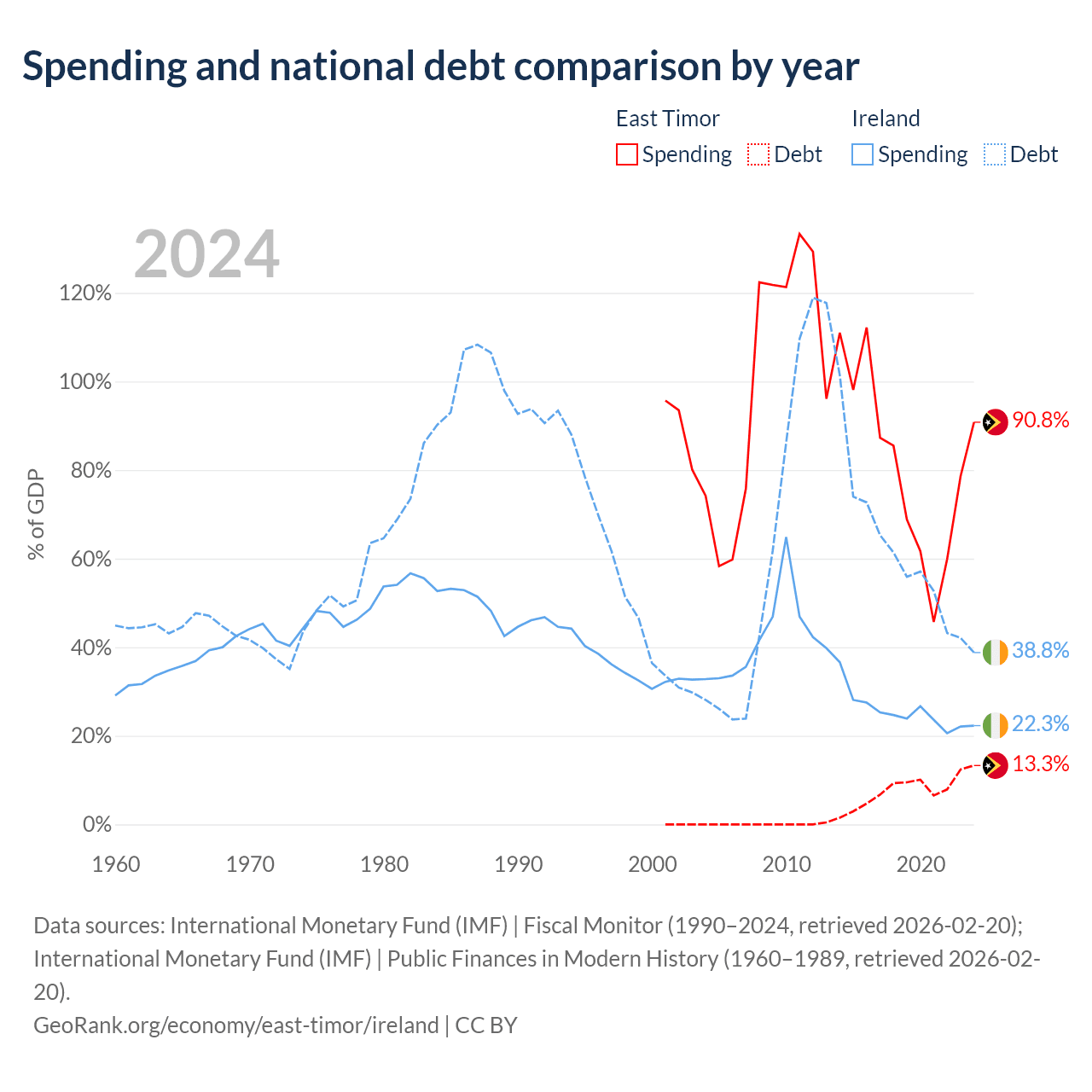 East Timor has $249M in government debt (13.3% of GDP), compared to $236B (38.8% of GDP) in Ireland.