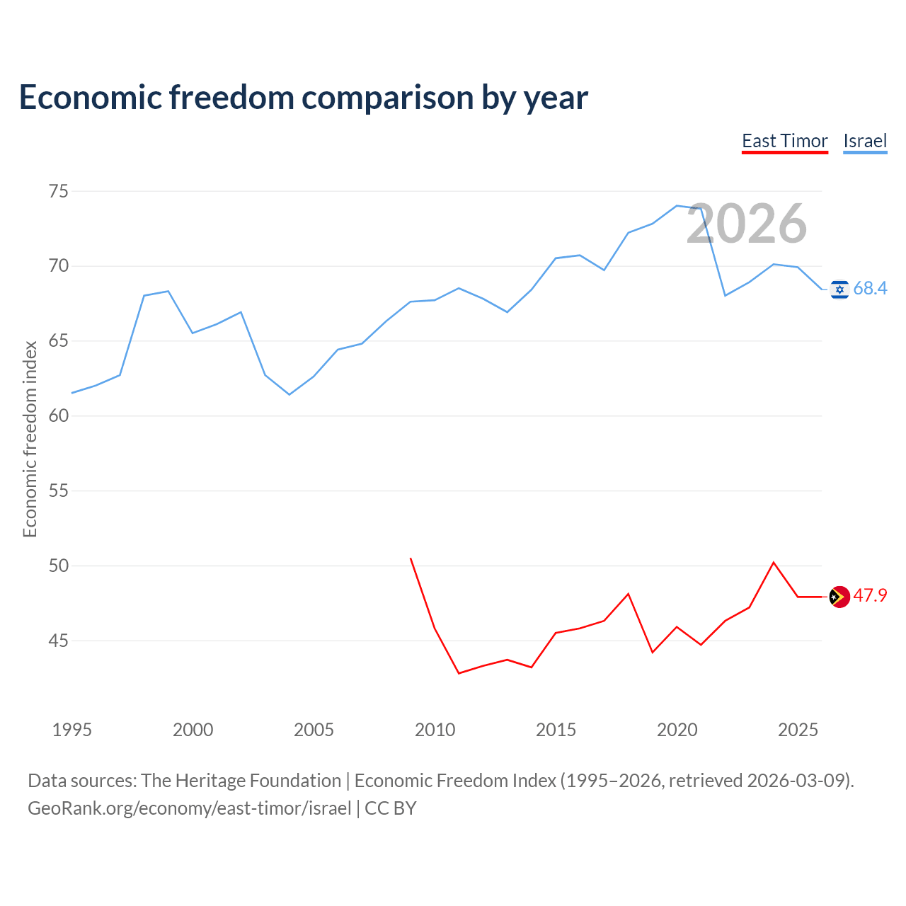 The Economic Freedom Index for East Timor is 47.9, ranking 173/197, compared to 68.4 for Israel, ranking 47/197. The chart above displays a comparison of annual changes in economic freedom indexes.