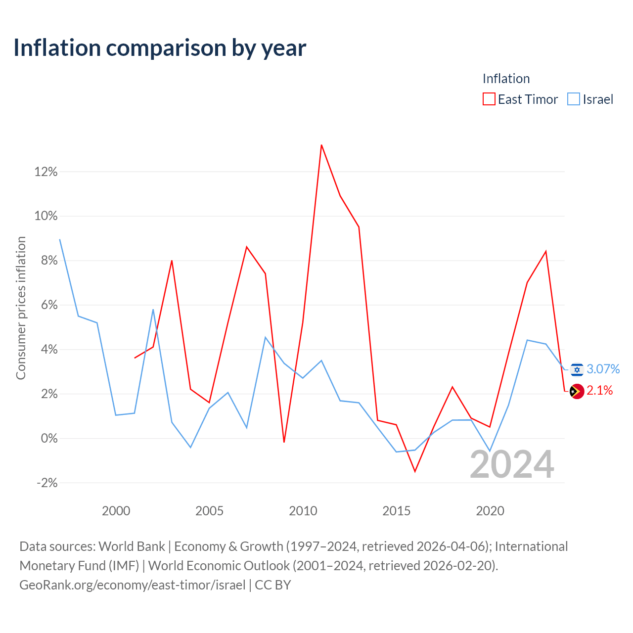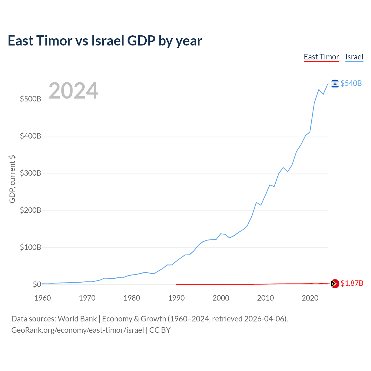 East Timor has a GDP of $1.87B compared to $540B for Israel, ranking 181/197 and 29/197 by economy size, respectively.