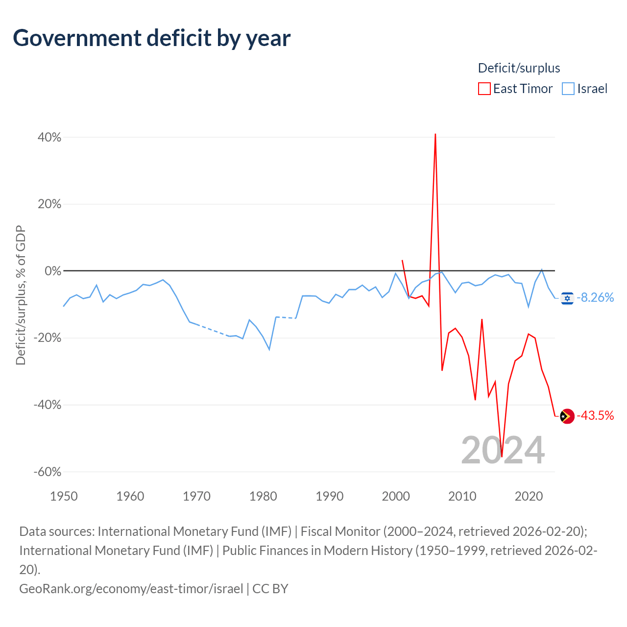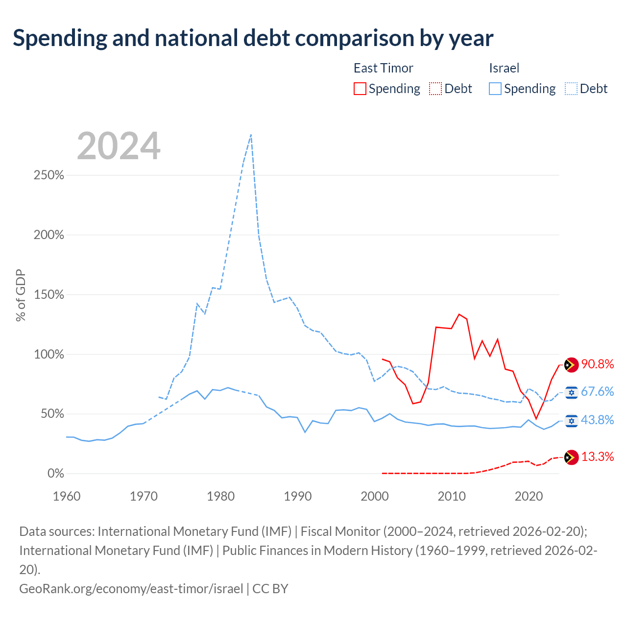 East Timor has $249M in government debt (13.3% of GDP), compared to $366B (67.6% of GDP) in Israel.