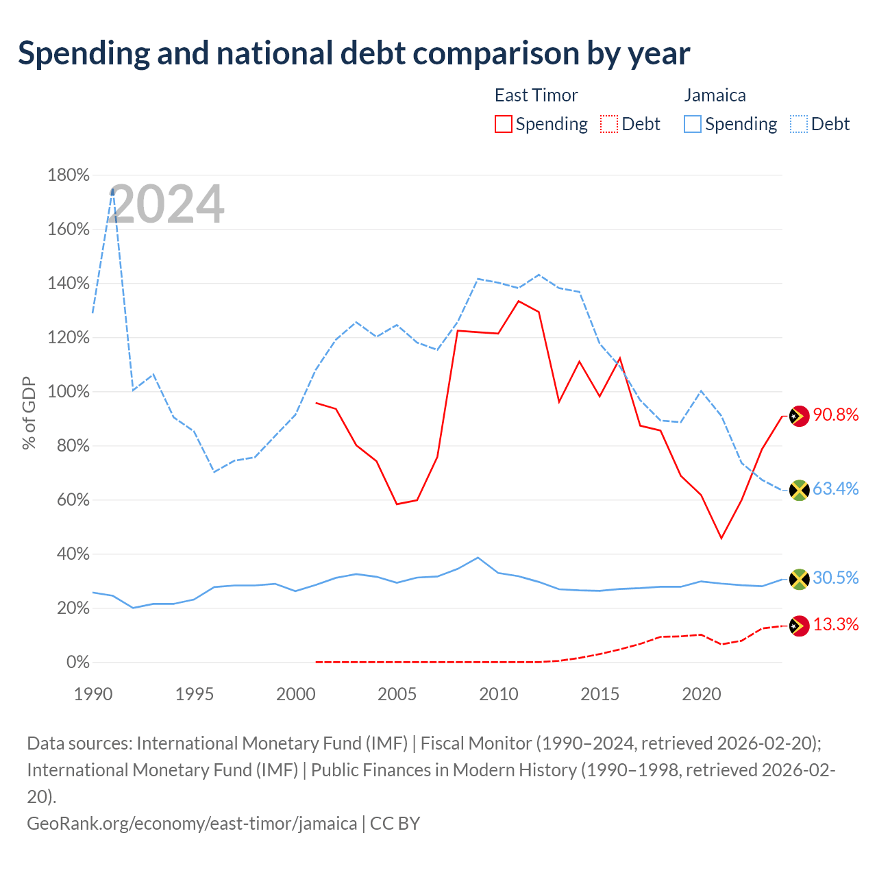 East Timor has $249M in government debt (13.3% of GDP), compared to $14B (63.4% of GDP) in Jamaica.