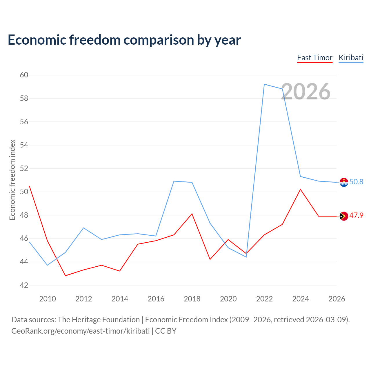 The Economic Freedom Index for East Timor is 47.9, ranking 173/197, compared to 50.8 for Kiribati, ranking 158/197. The chart above displays a comparison of annual changes in economic freedom indexes.