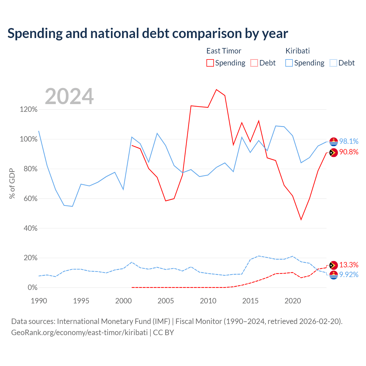 East Timor has $249M in government debt (13.3% of GDP), compared to $30.5M (9.92% of GDP) in Kiribati.