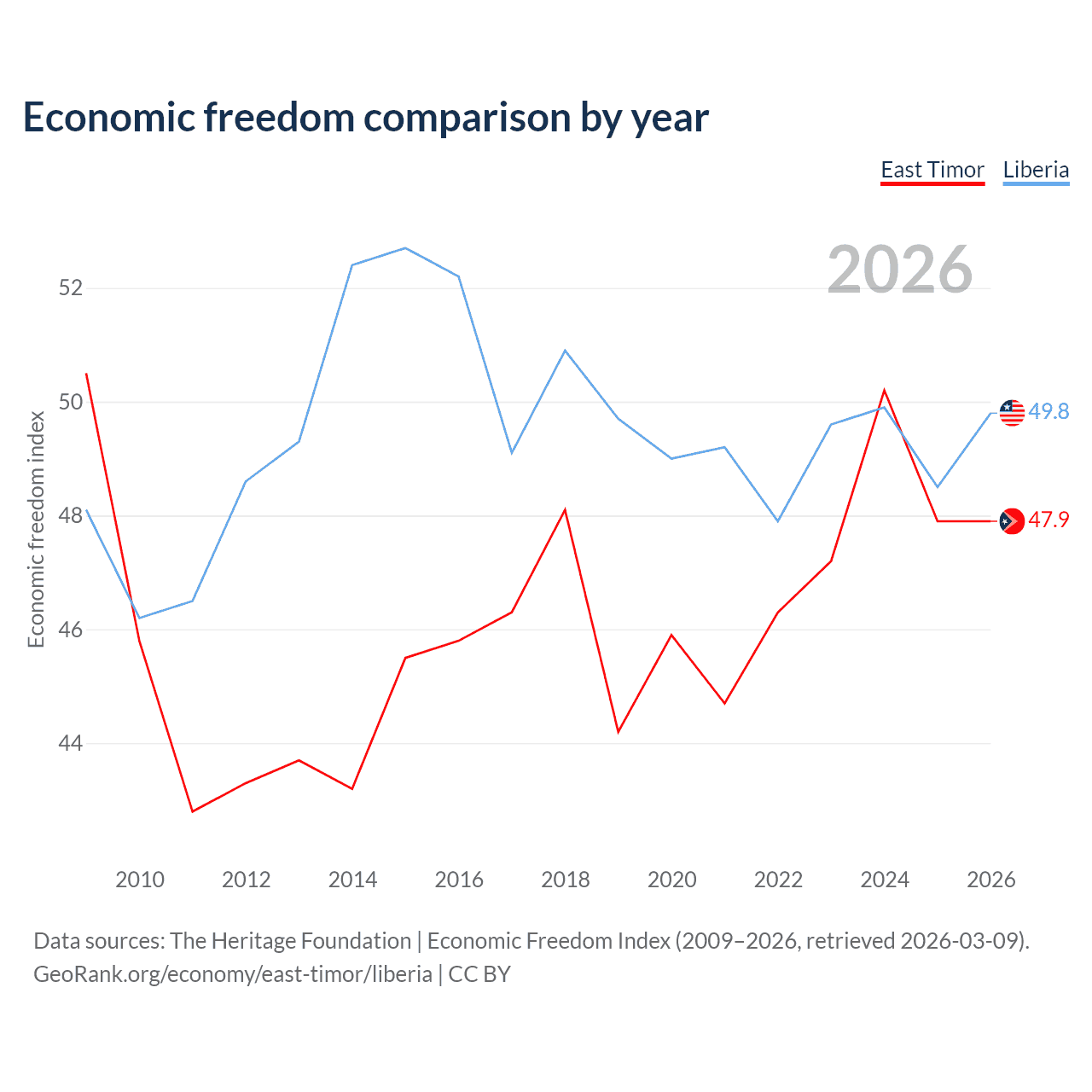The Economic Freedom Index for East Timor is 47.9, ranking 173/197, compared to 49.8 for Liberia, ranking 163/197. The chart above displays a comparison of annual changes in economic freedom indexes.
