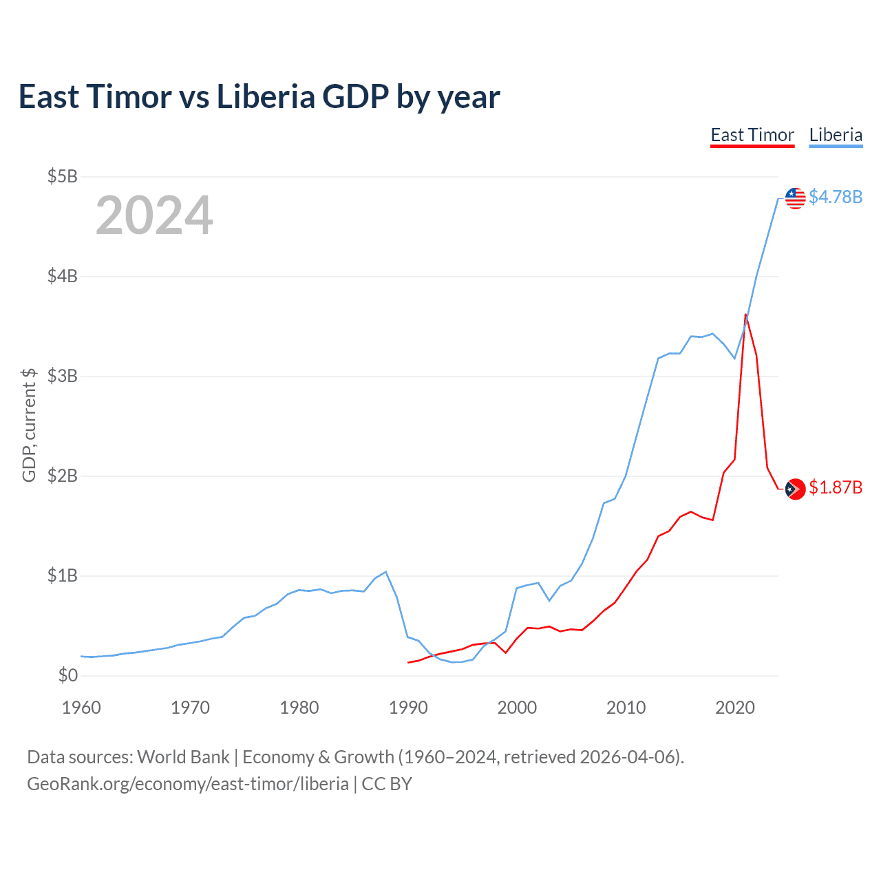 East Timor has a GDP of $1.87B compared to $4.78B for Liberia, ranking 181/197 and 163/197 by economy size, respectively.