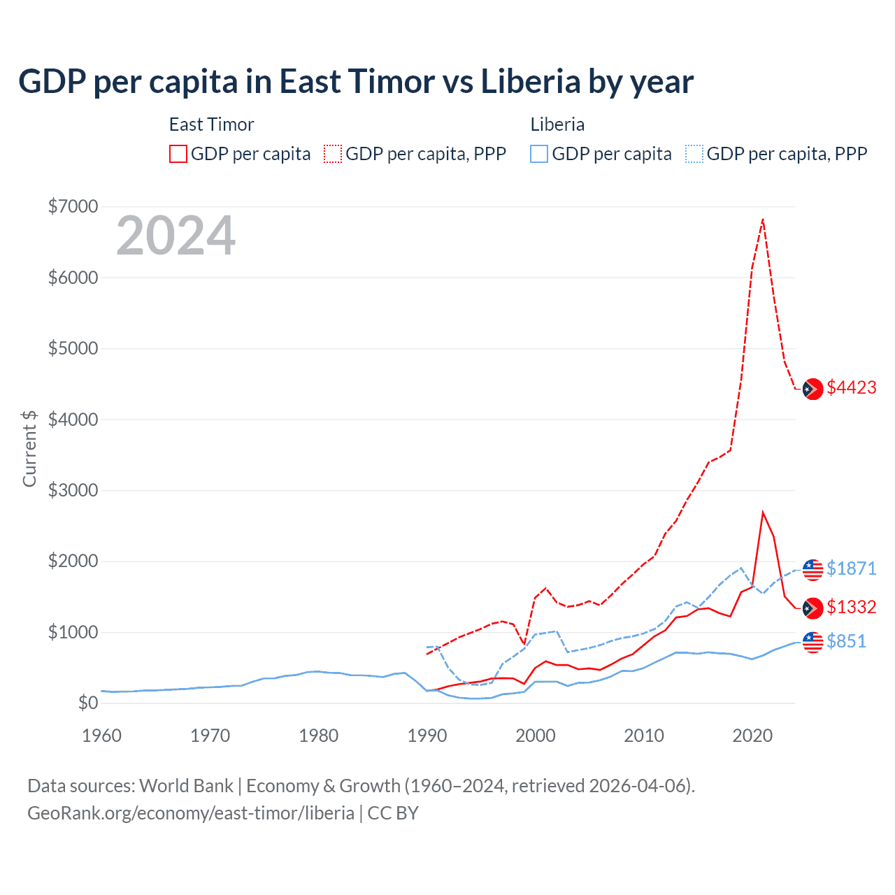 GDP per capita in East Timor vs Liberia by year