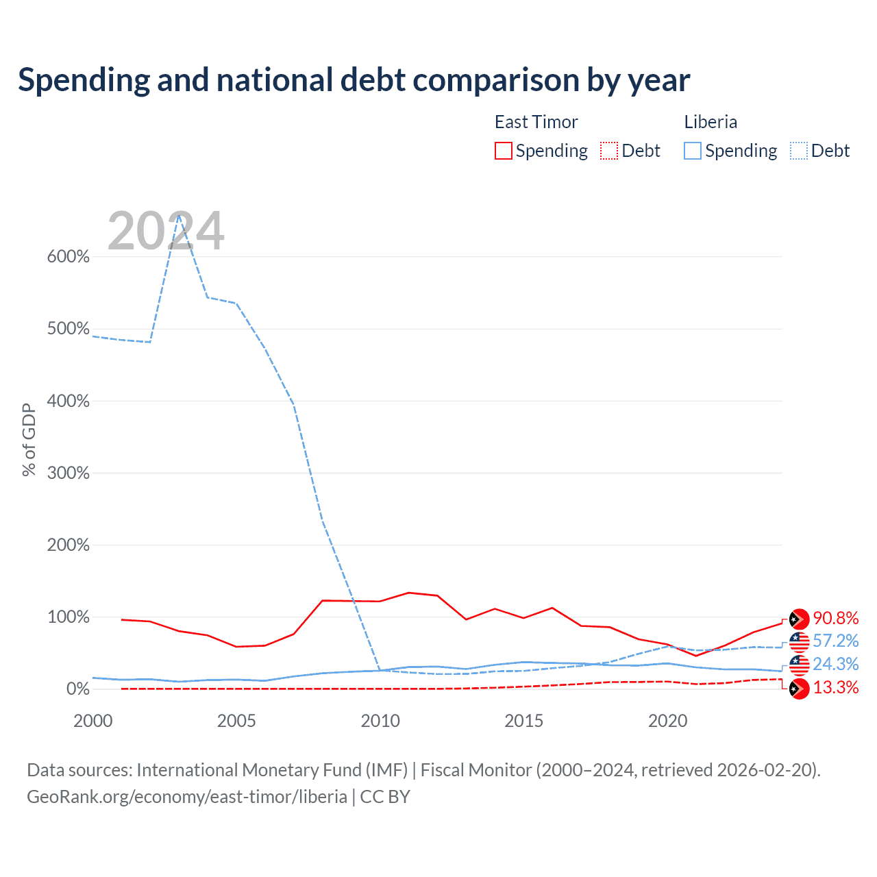 East Timor has $249M in government debt (13.3% of GDP), compared to $2.73B (57.2% of GDP) in Liberia.