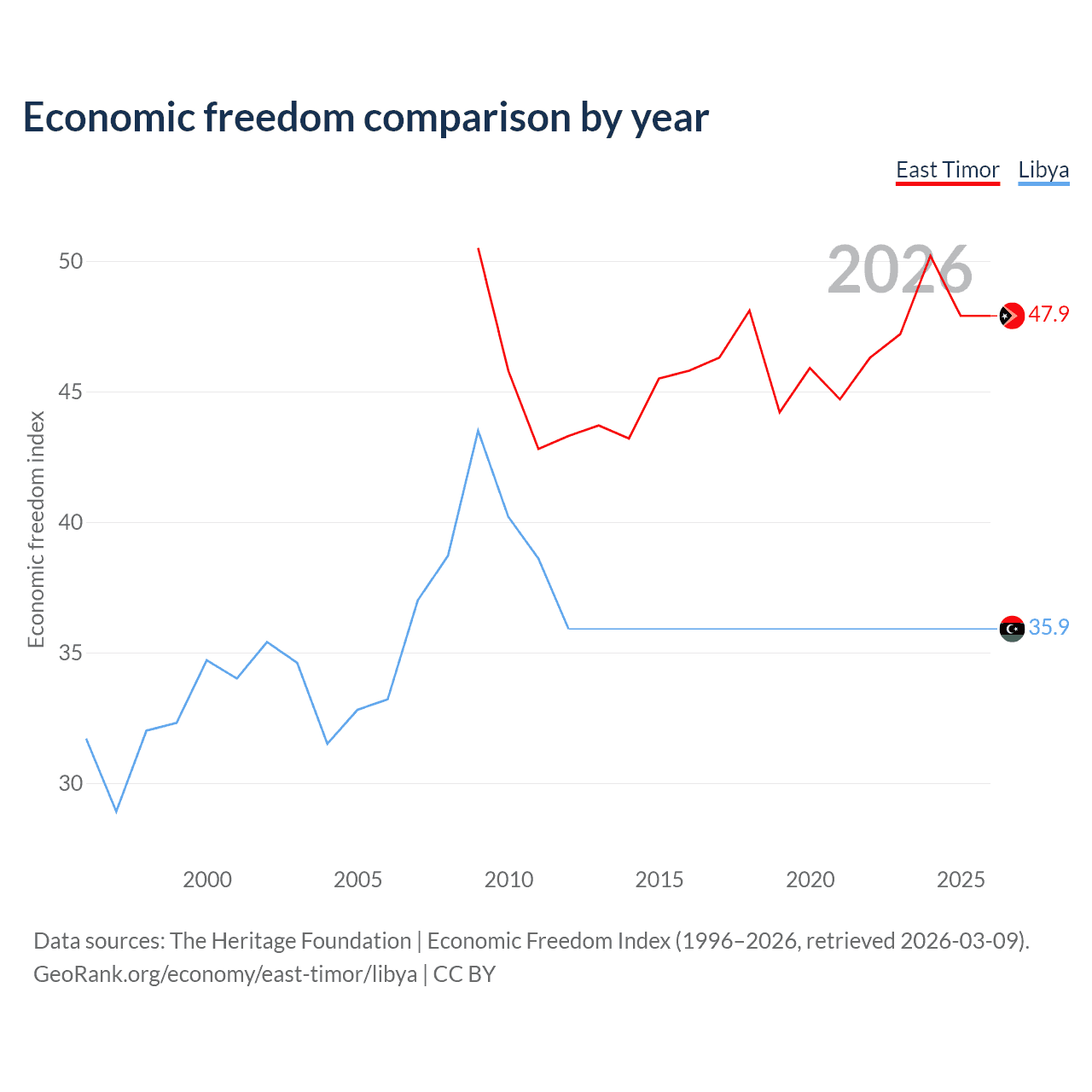 The Economic Freedom Index for East Timor is 47.9, ranking 173/197, compared to 35.9 for Libya, ranking 189/197. The chart above displays a comparison of annual changes in economic freedom indexes.