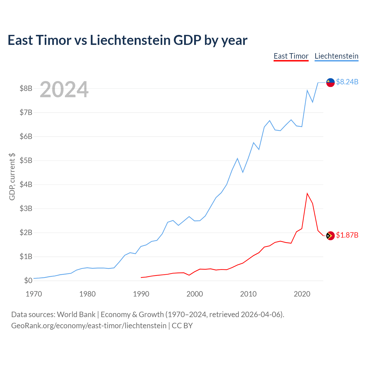 East Timor has a GDP of $1.87B compared to $8.24B for Liechtenstein, ranking 181/197 and 156/197 by economy size, respectively.
