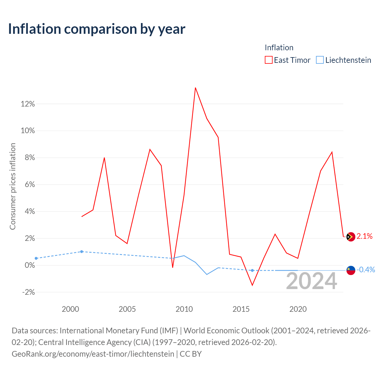 Over the past 20 years, East Timor has recorded an average annual inflation rate of 4.17%, compared with -0.01% in Liechtenstein. In 2020, inflation was 2.1% in East Timor and -0.4% in Liechtenstein.