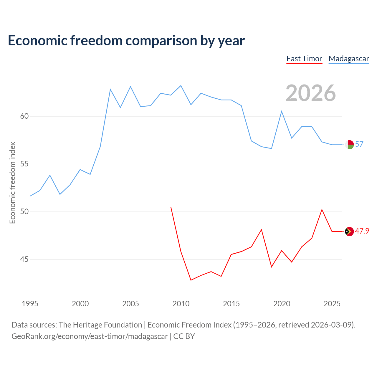 The Economic Freedom Index for East Timor is 47.9, ranking 173/197, compared to 57 for Madagascar, ranking 119/197. The chart above displays a comparison of annual changes in economic freedom indexes.