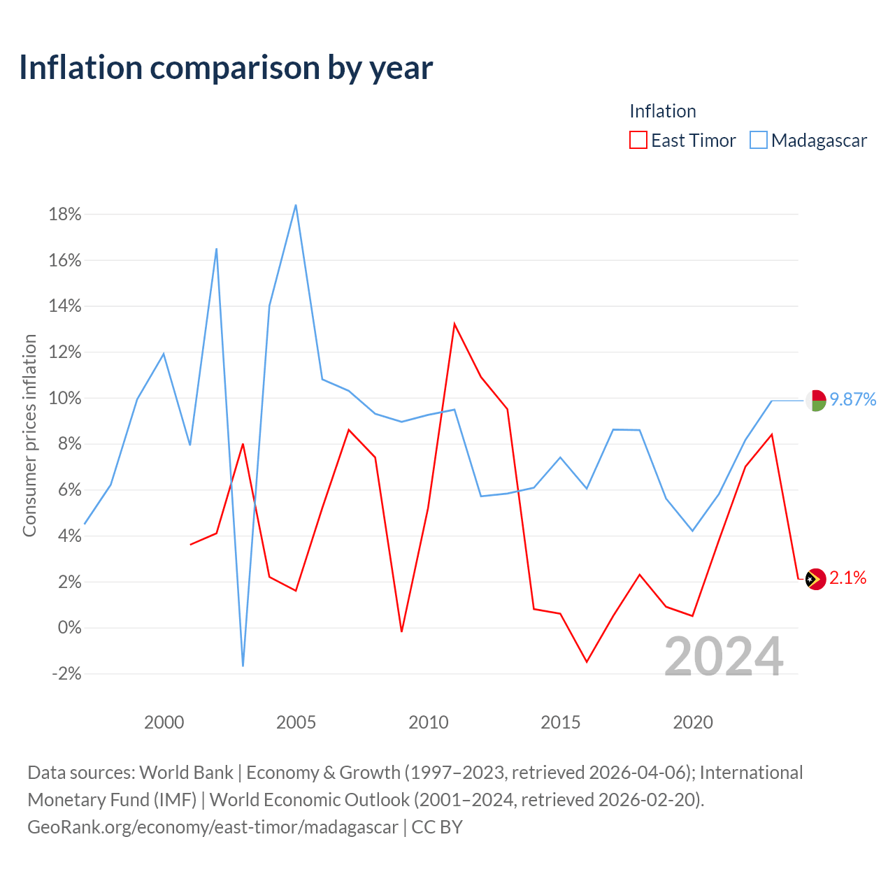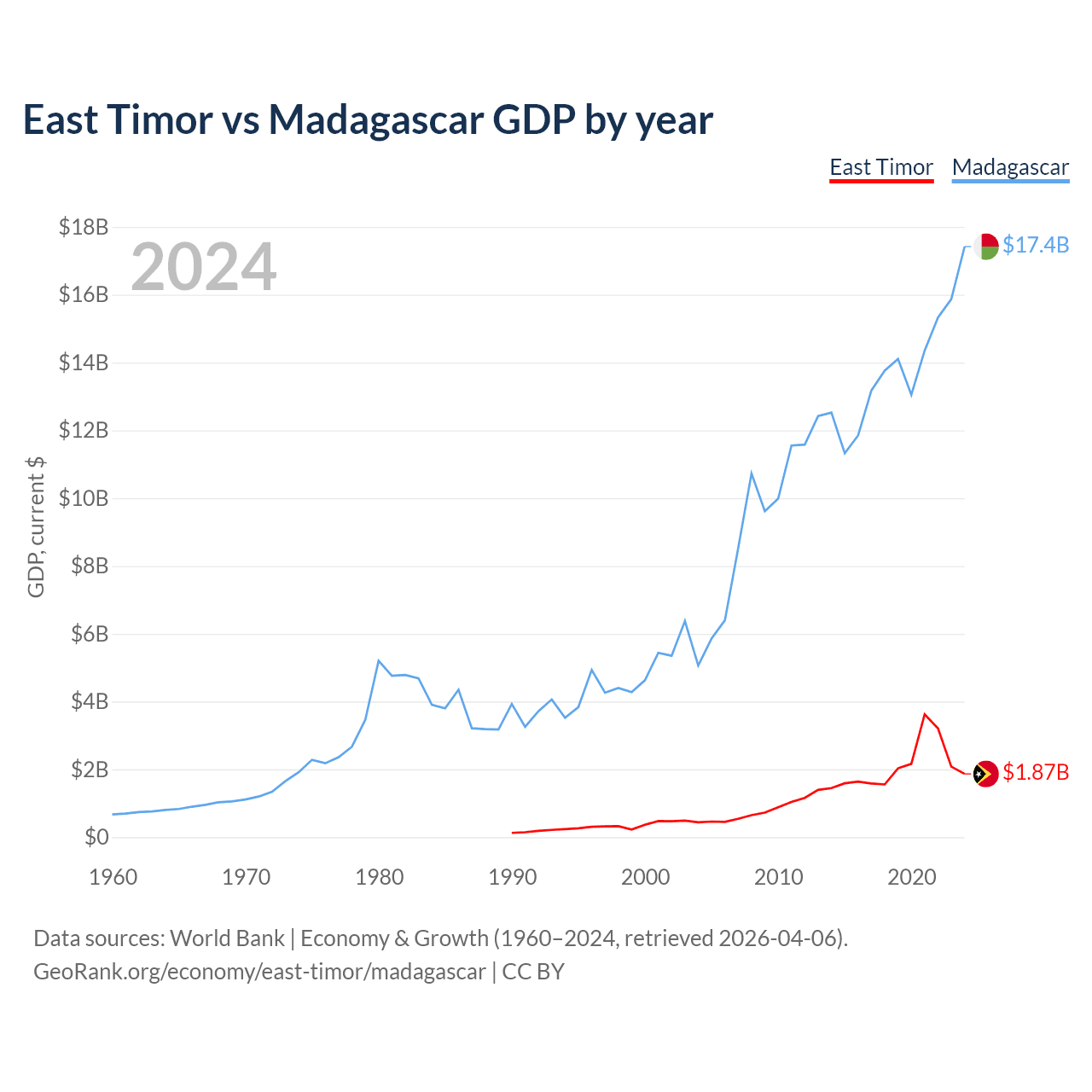 East Timor has a GDP of $1.87B compared to $17.4B for Madagascar, ranking 181/197 and 136/197 by economy size, respectively.