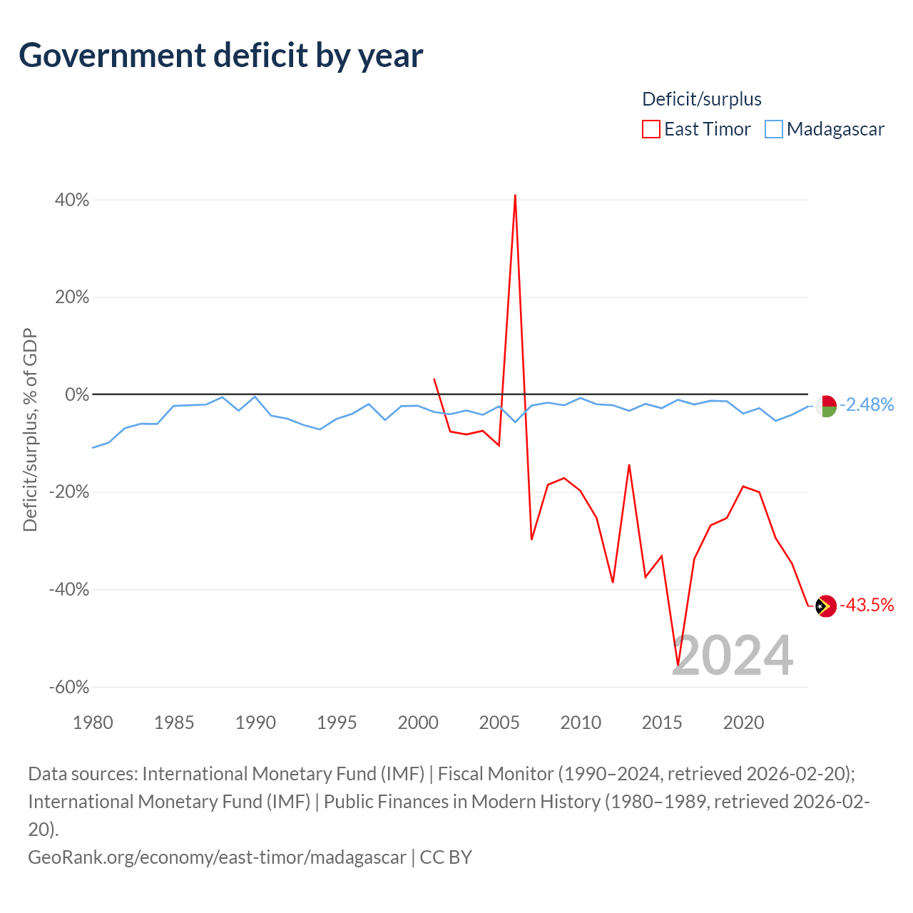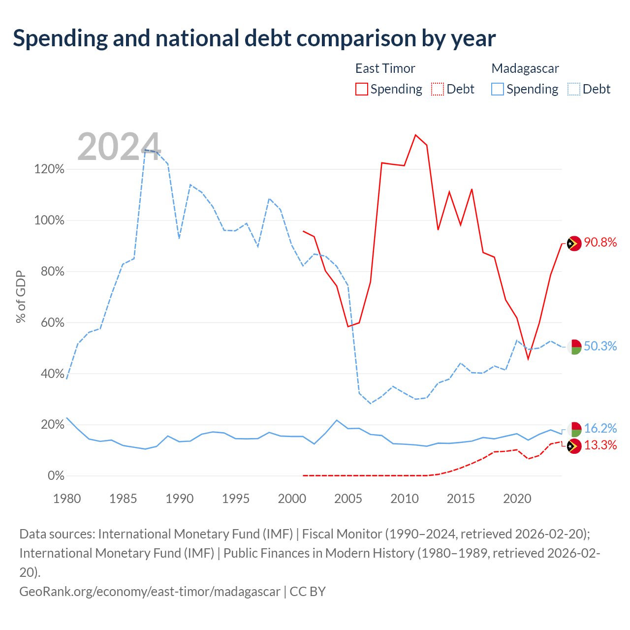 East Timor has $249M in government debt (13.3% of GDP), compared to $8.77B (50.3% of GDP) in Madagascar.