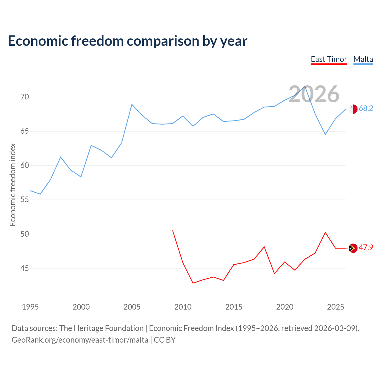 The Economic Freedom Index for East Timor is 47.9, ranking 173/197, compared to 68.2 for Malta, ranking 49/197. The chart above displays a comparison of annual changes in economic freedom indexes.