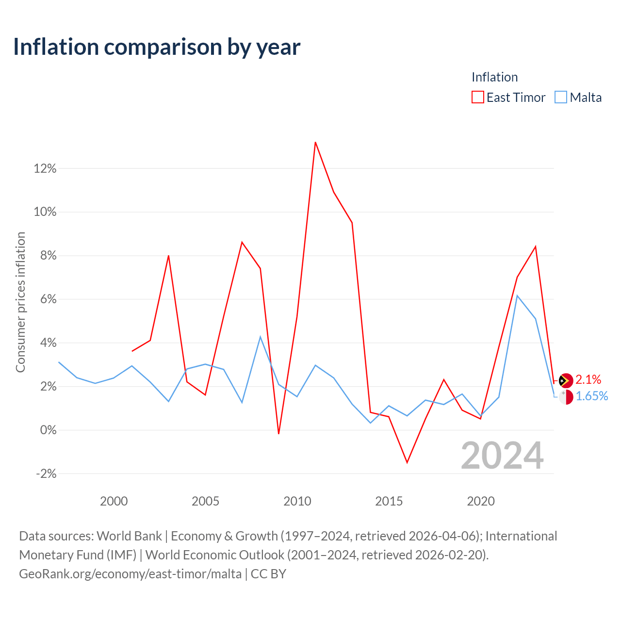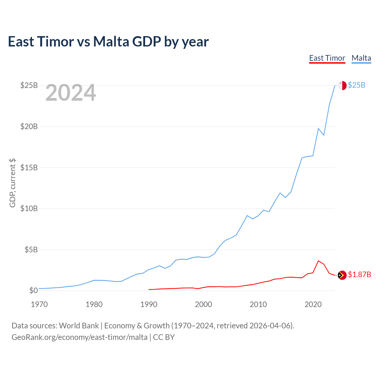 East Timor has a GDP of $1.87B compared to $25B for Malta, ranking 181/197 and 119/197 by economy size, respectively.