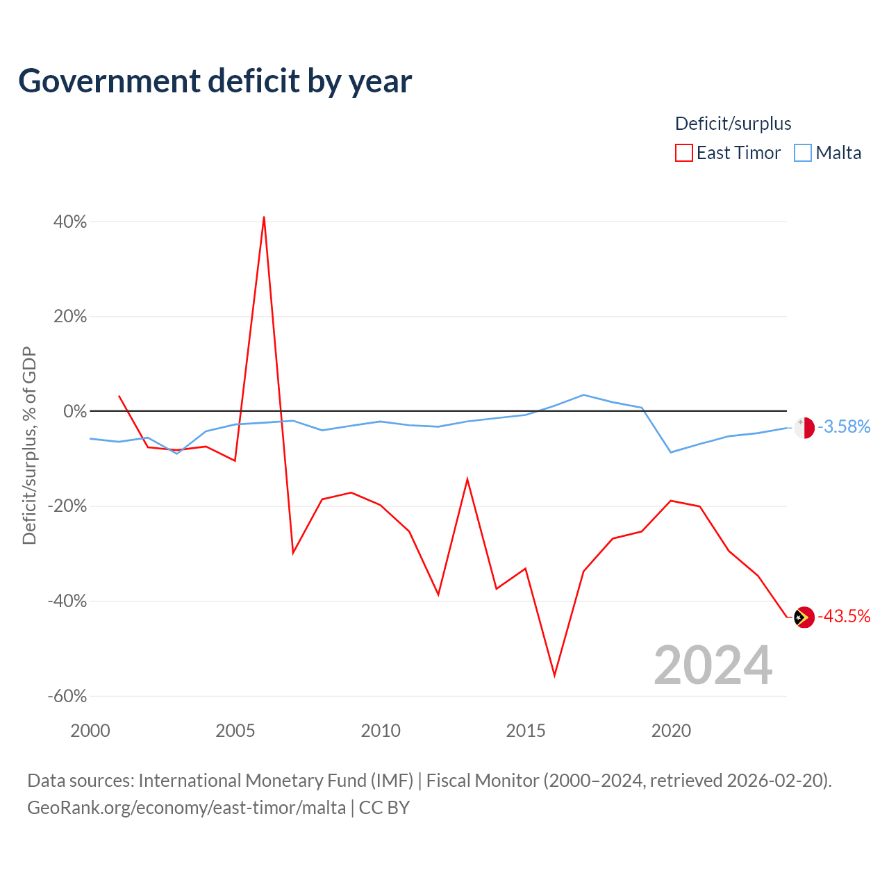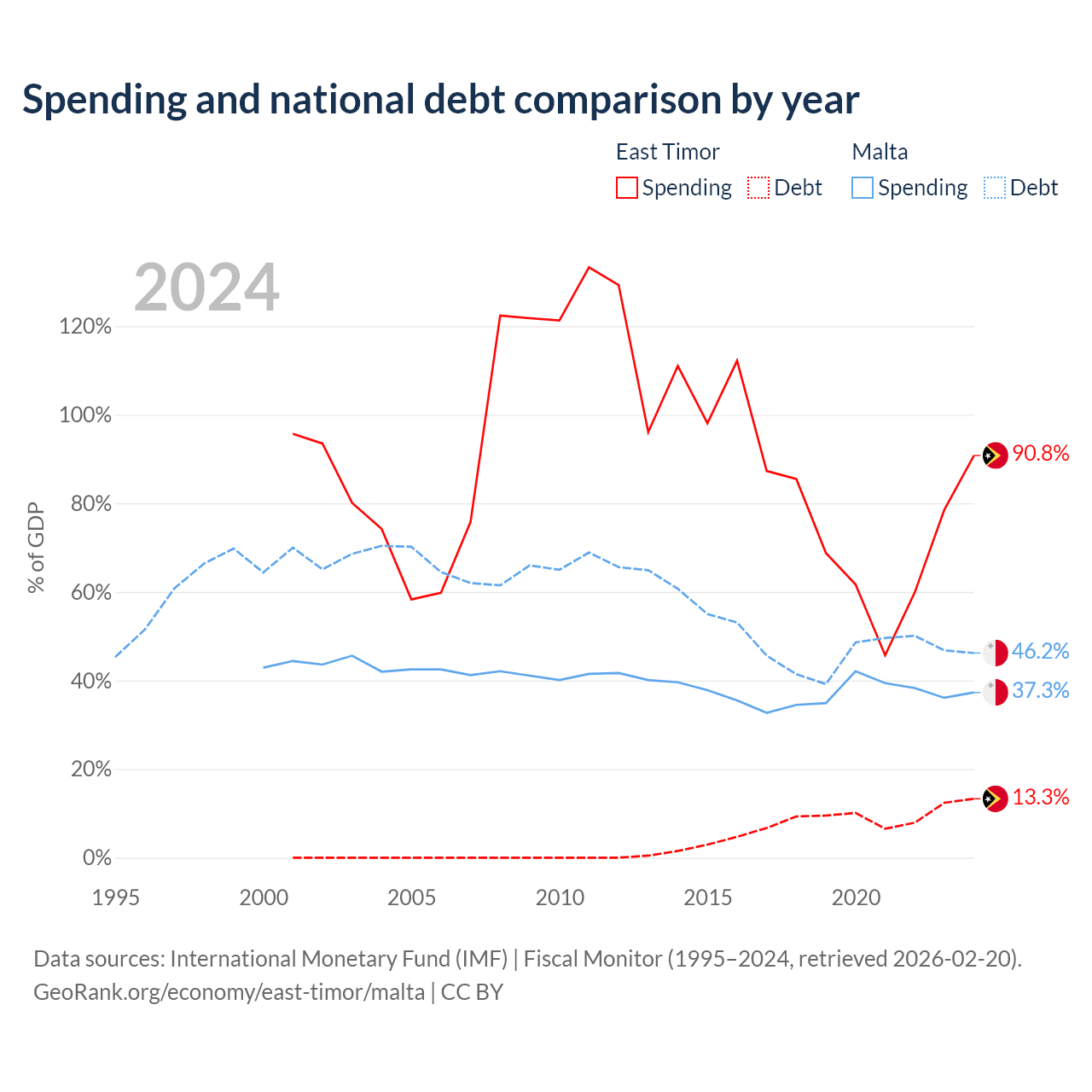 East Timor has $249M in government debt (13.3% of GDP), compared to $11.5B (46.2% of GDP) in Malta.