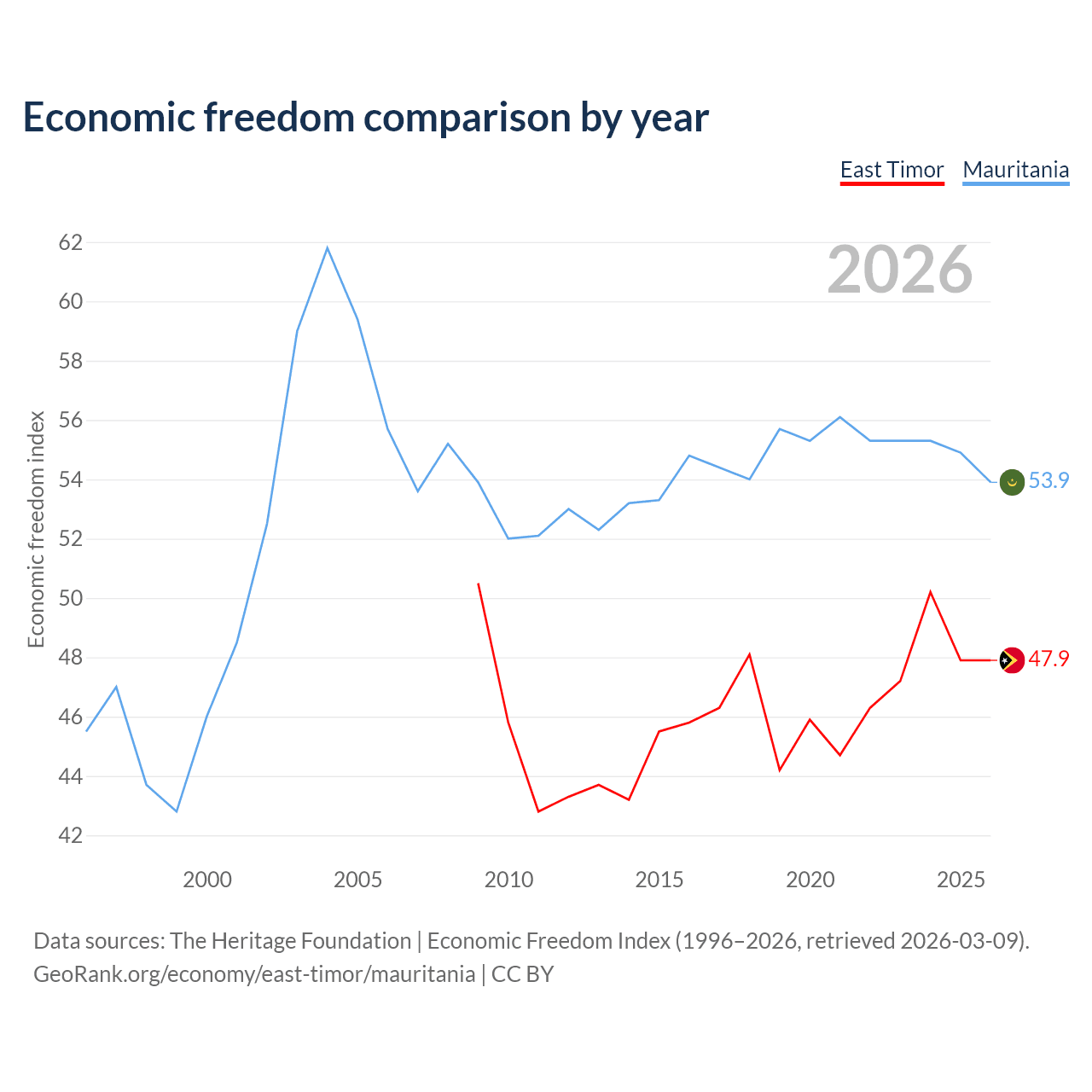 The Economic Freedom Index for East Timor is 47.9, ranking 173/197, compared to 53.9 for Mauritania, ranking 136/197. The chart above displays a comparison of annual changes in economic freedom indexes.