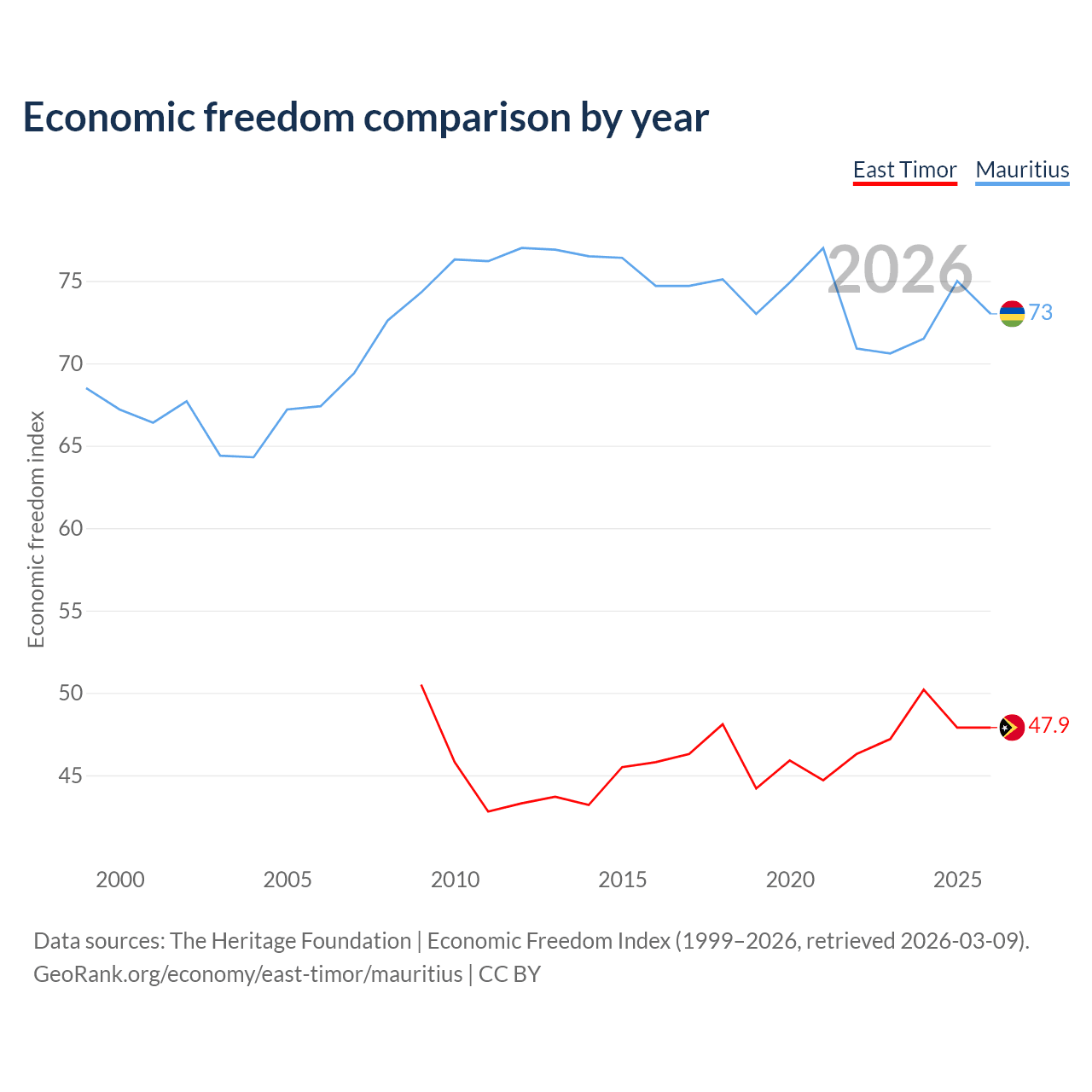 The Economic Freedom Index for East Timor is 47.9, ranking 173/197, compared to 73 for Mauritius, ranking 26/197. The chart above displays a comparison of annual changes in economic freedom indexes.