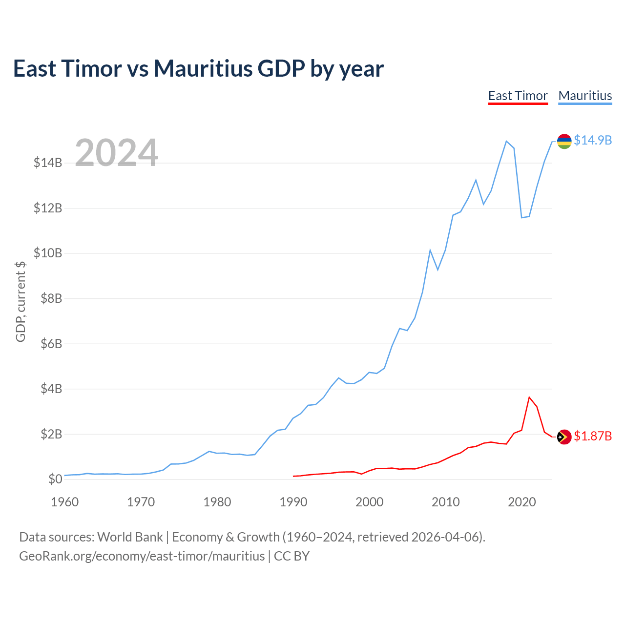 East Timor has a GDP of $1.87B compared to $14.9B for Mauritius, ranking 181/197 and 143/197 by economy size, respectively.