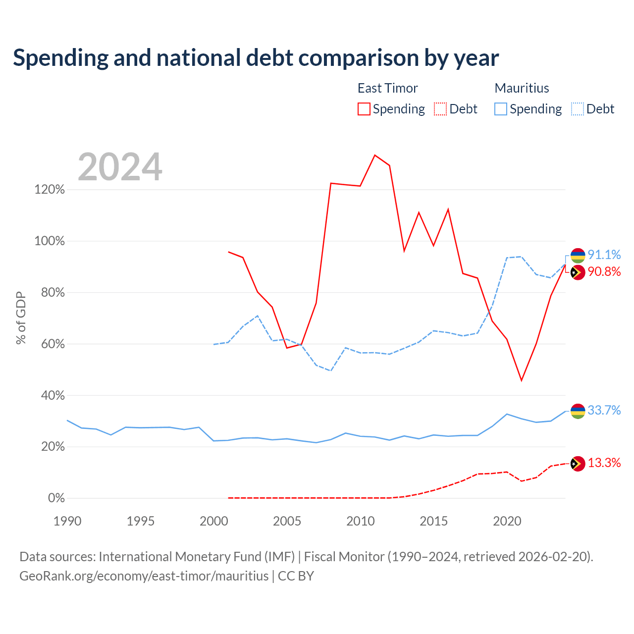 East Timor has $249M in government debt (13.3% of GDP), compared to $13.6B (91.1% of GDP) in Mauritius.