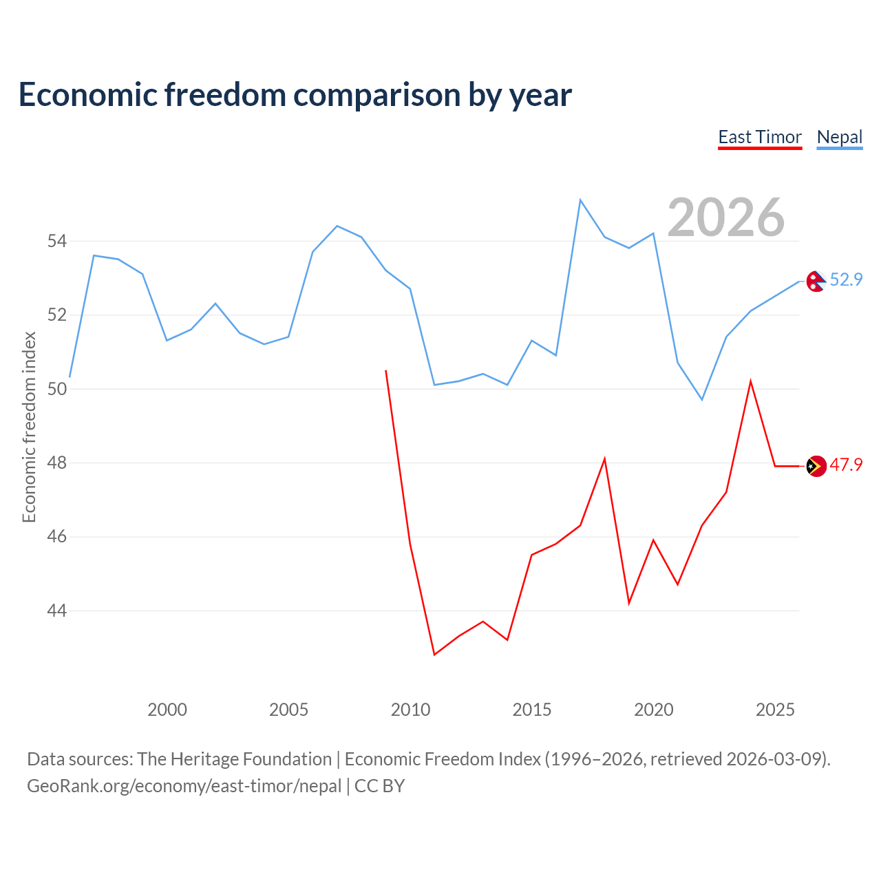 The Economic Freedom Index for East Timor is 47.9, ranking 173/197, compared to 52.9 for Nepal, ranking 144/197. The chart above displays a comparison of annual changes in economic freedom indexes.