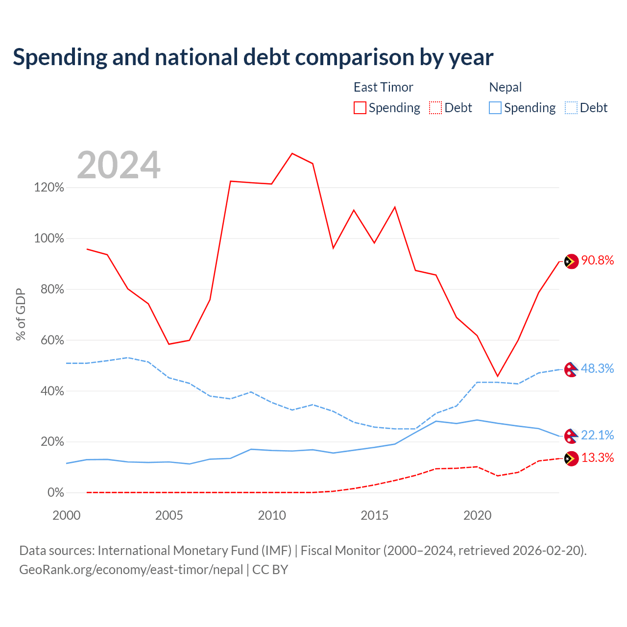East Timor has $249M in government debt (13.3% of GDP), compared to $20.7B (48.3% of GDP) in Nepal.