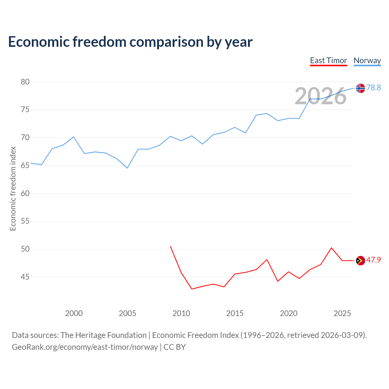 The Economic Freedom Index for East Timor is 47.9, ranking 173/197, compared to 78.8 for Norway, ranking 9/197. The chart above displays a comparison of annual changes in economic freedom indexes.