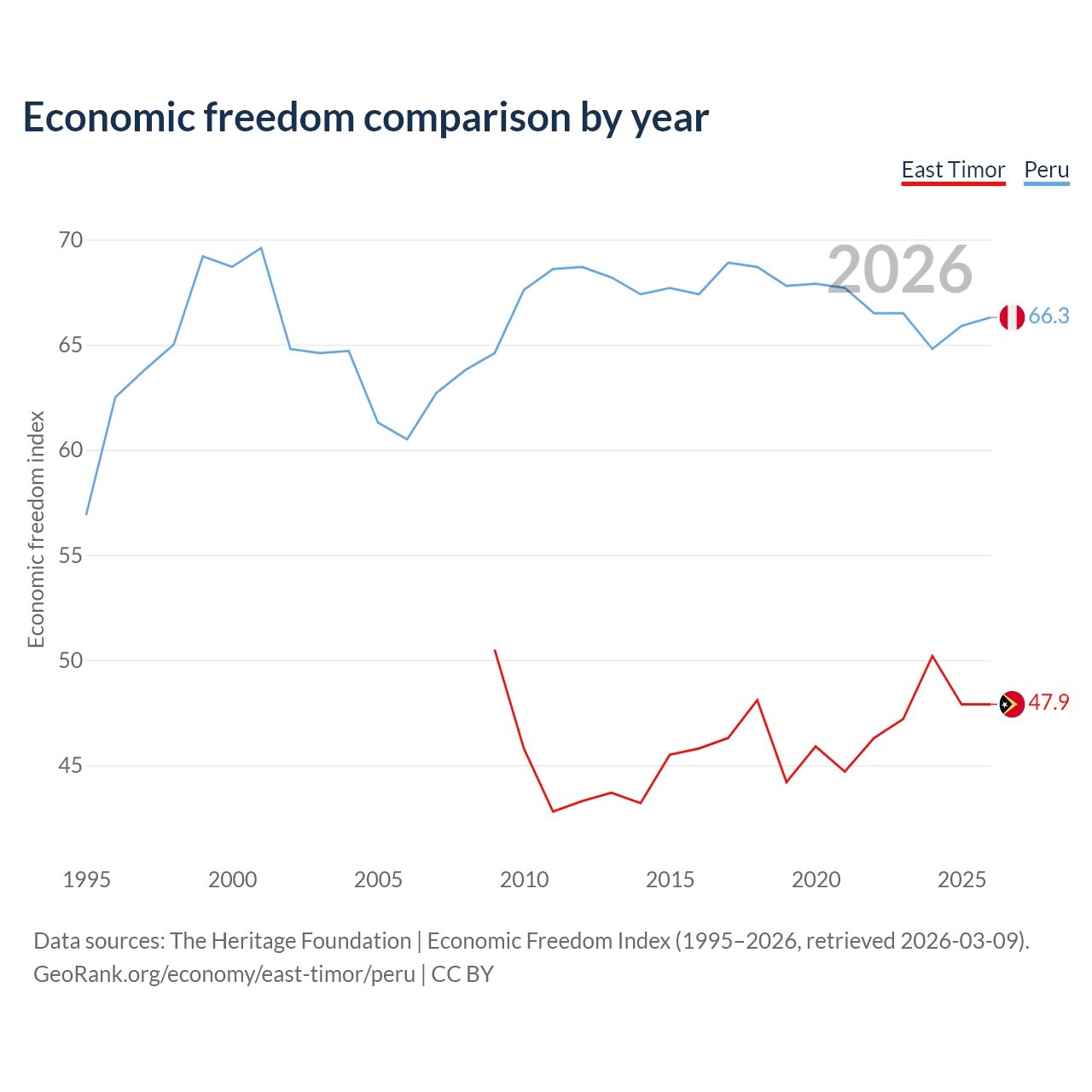 The Economic Freedom Index for East Timor is 47.9, ranking 173/197, compared to 66.3 for Peru, ranking 62/197. The chart above displays a comparison of annual changes in economic freedom indexes.