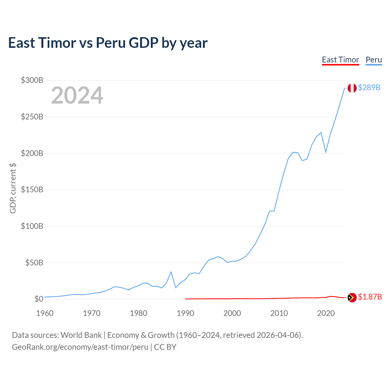 East Timor has a GDP of $1.87B compared to $289B for Peru, ranking 181/197 and 49/197 by economy size, respectively.