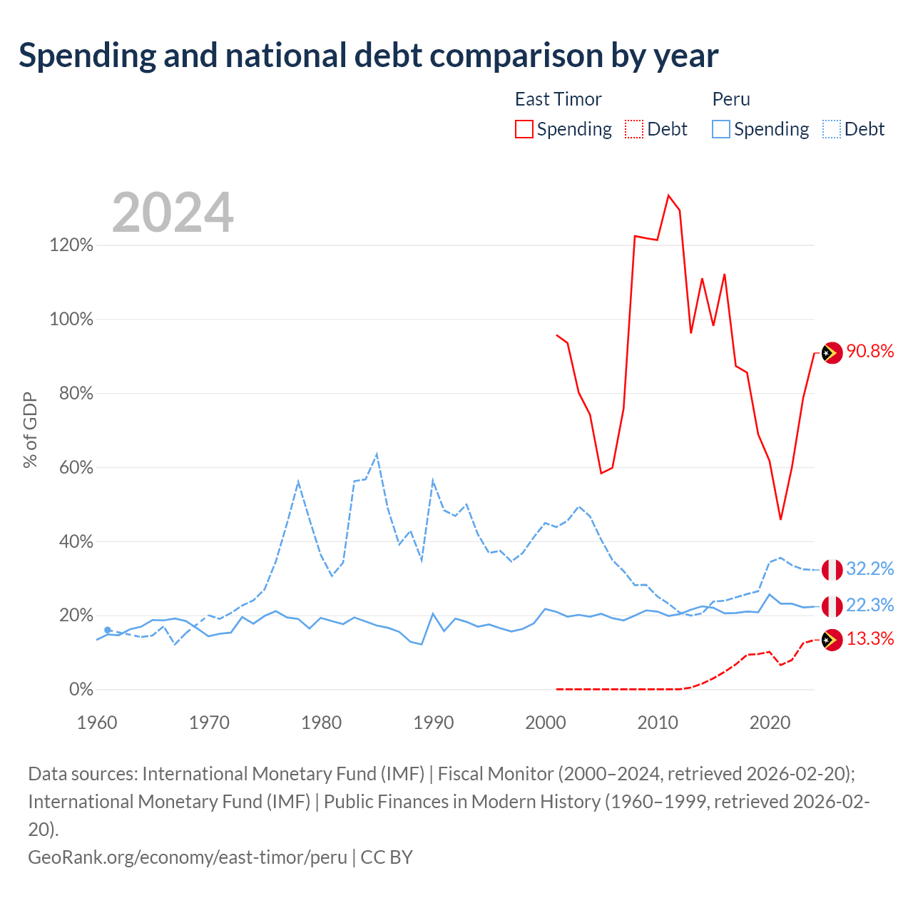East Timor has $249M in government debt (13.3% of GDP), compared to $93B (32.2% of GDP) in Peru.