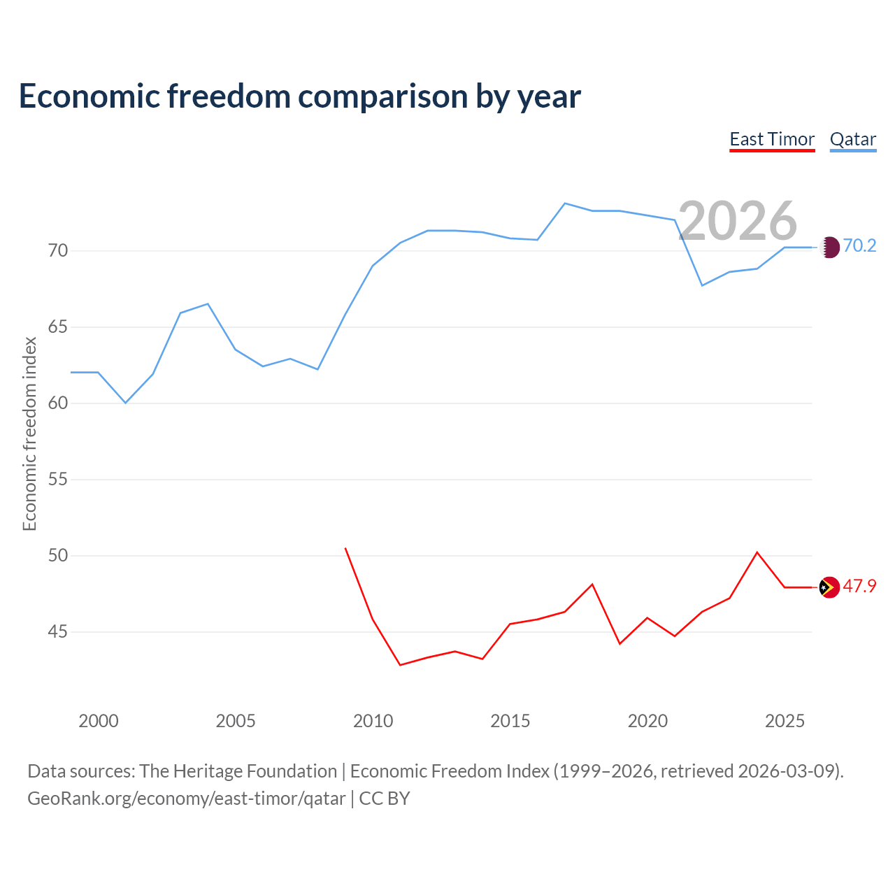 The Economic Freedom Index for East Timor is 47.9, ranking 173/197, compared to 70.2 for Qatar, ranking 37/197. The chart above displays a comparison of annual changes in economic freedom indexes.