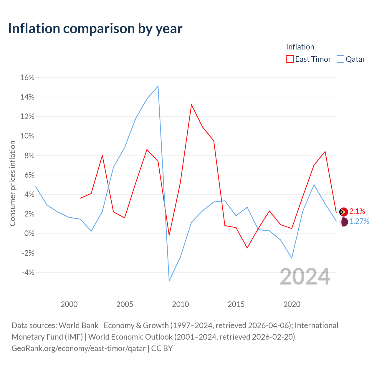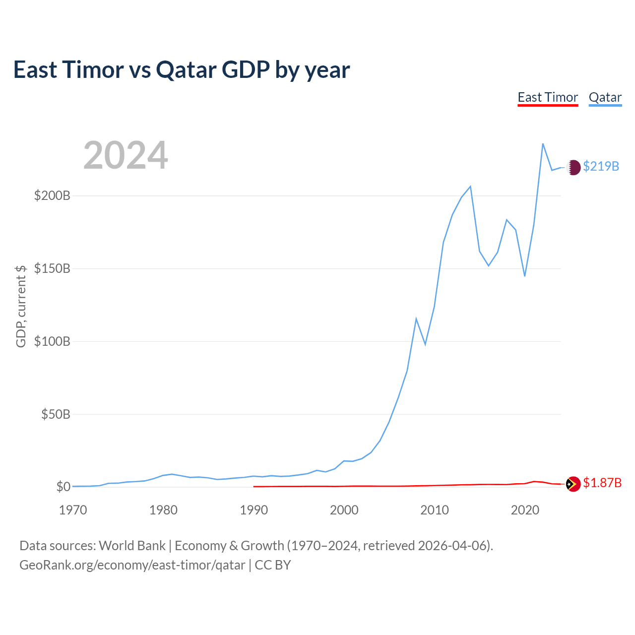 East Timor has a GDP of $1.87B compared to $219B for Qatar, ranking 181/197 and 56/197 by economy size, respectively.