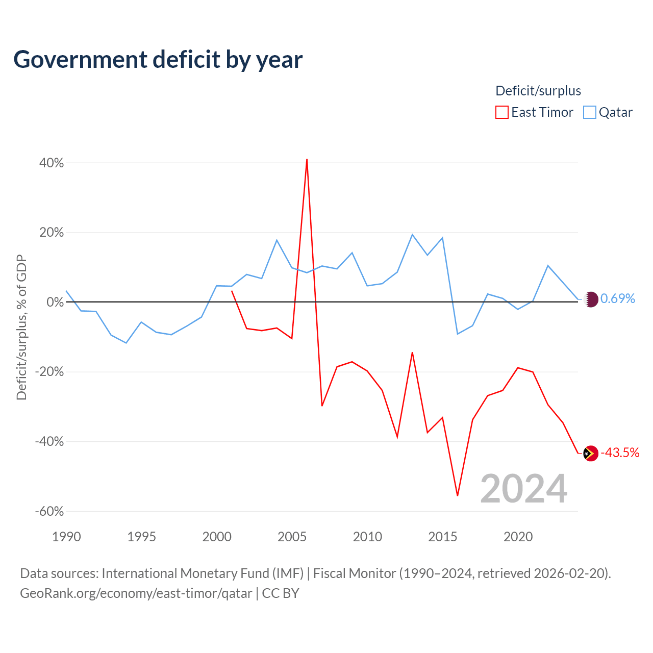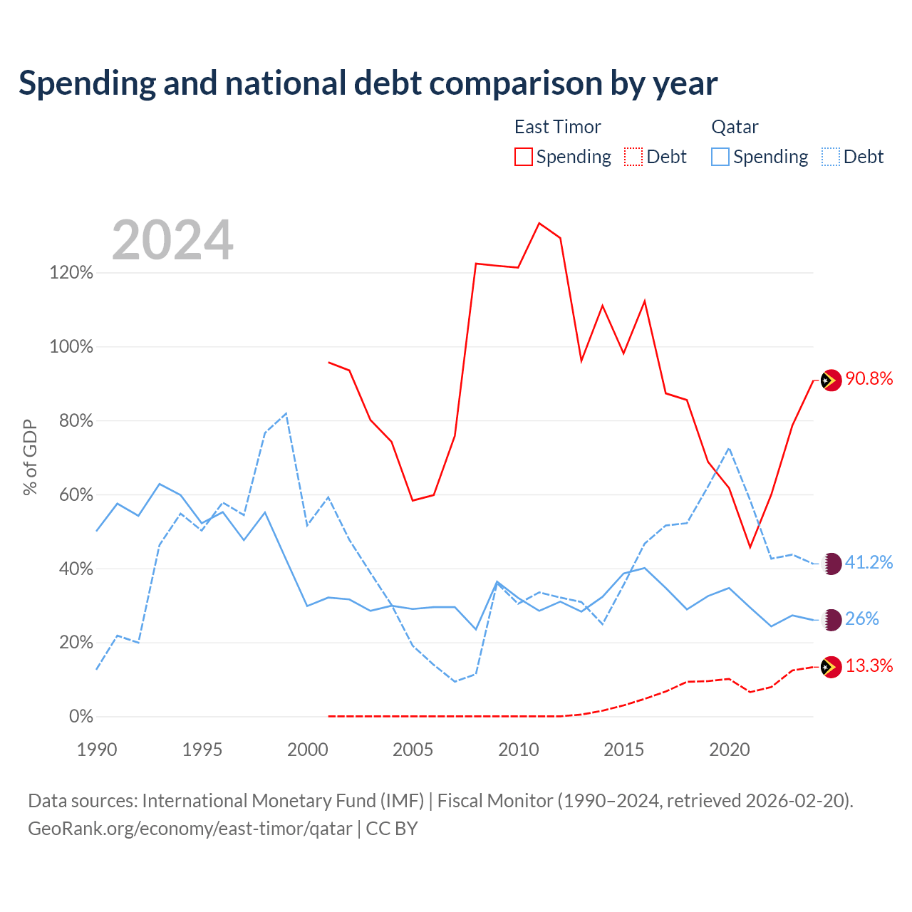 East Timor has $249M in government debt (13.3% of GDP), compared to $90.2B (41.2% of GDP) in Qatar.