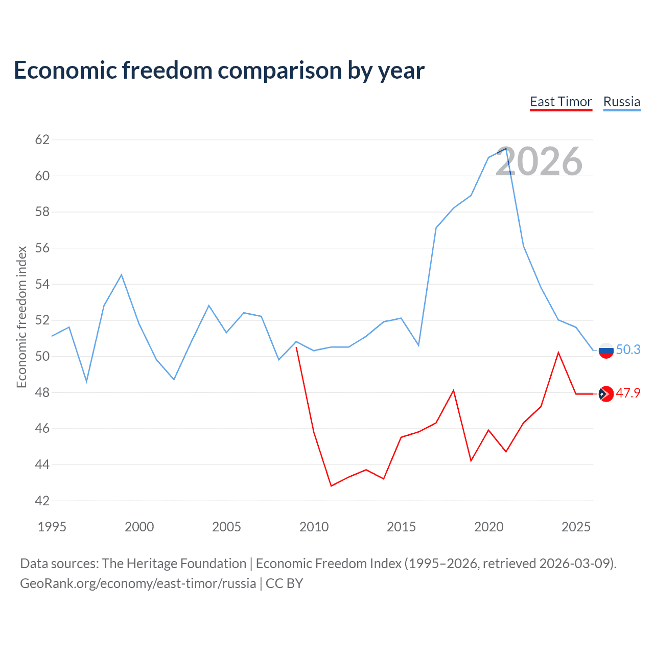The Economic Freedom Index for East Timor is 47.9, ranking 173/197, compared to 50.3 for Russia, ranking 161/197. The chart above displays a comparison of annual changes in economic freedom indexes.