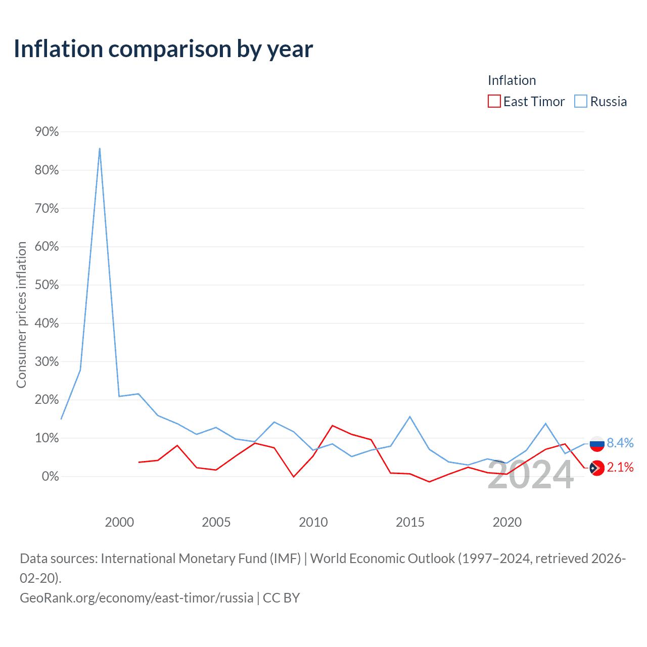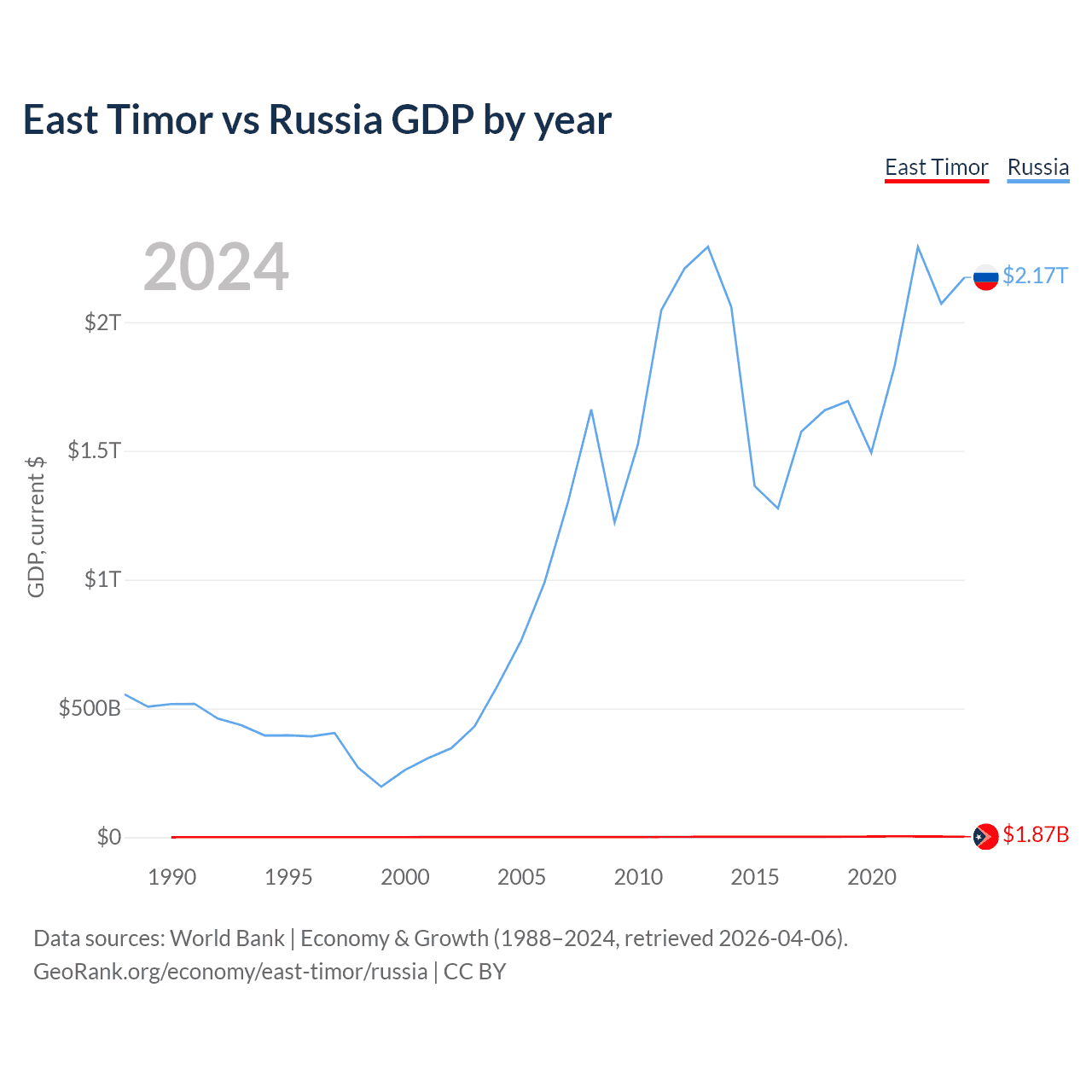 East Timor has a GDP of $1.87B compared to $2.17T for Russia, ranking 181/197 and 11/197 by economy size, respectively.