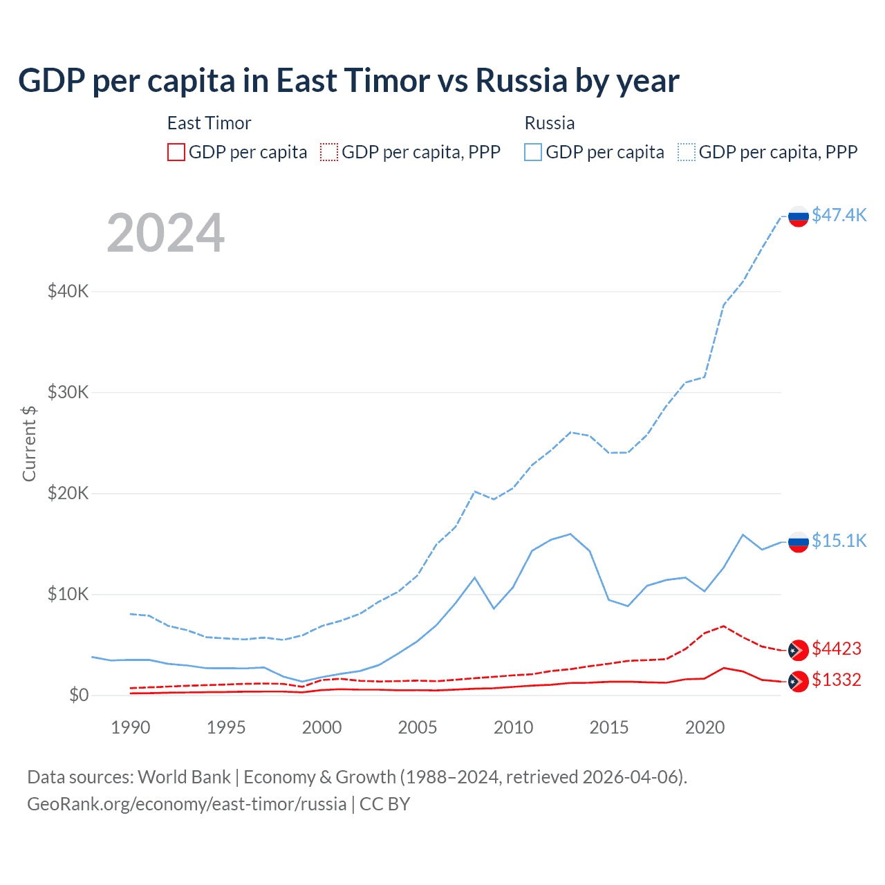 East Timor's GDP per capita is $1,332, ranking 167/197, compared to $15,145 in Russia, ranking 68/197. Adjusted for purchasing power (GDP per capita PPP), East Timor ranks 163rd at $4,423, while Russia ranks 50th at $47,405.