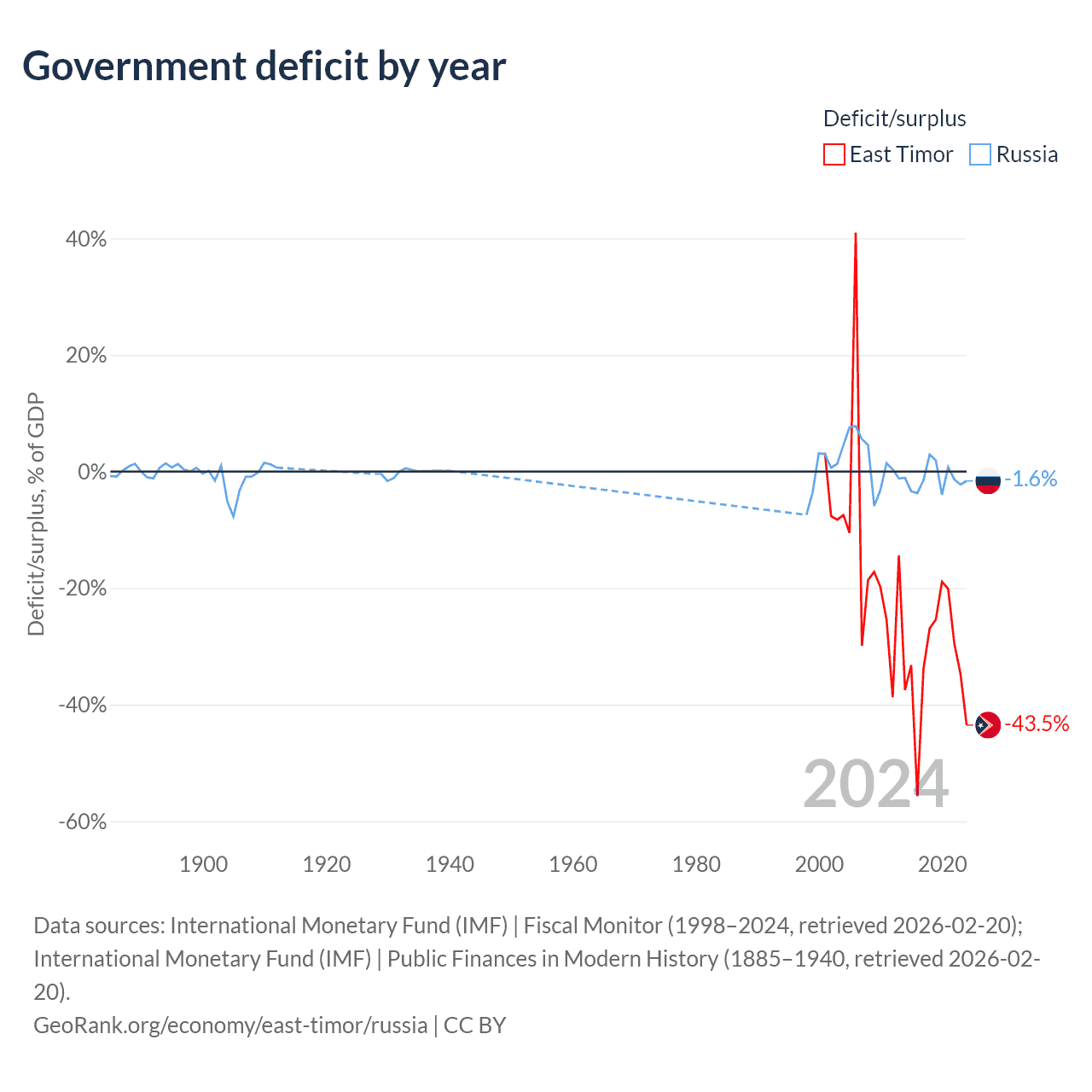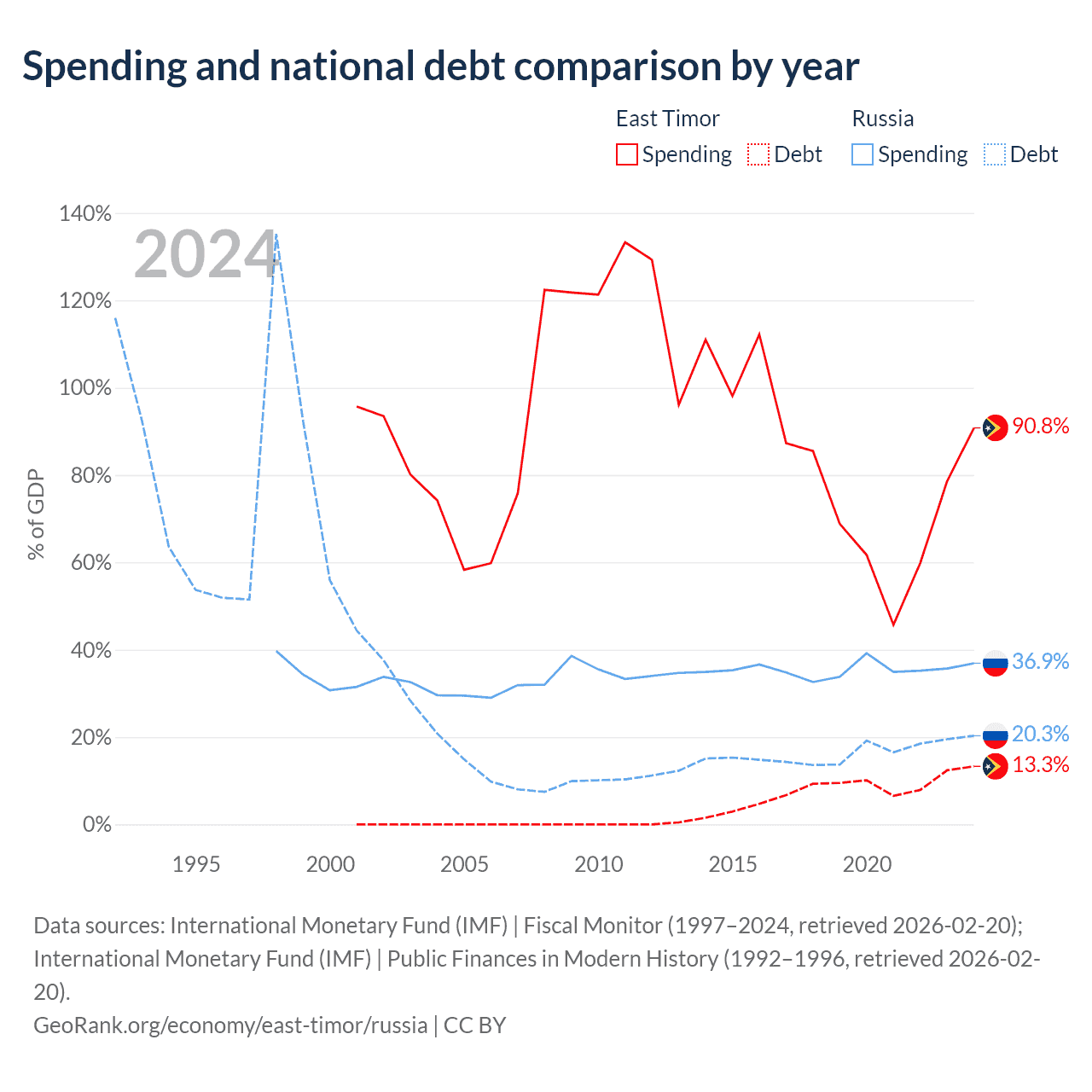 East Timor has $249M in government debt (13.3% of GDP), compared to $440B (20.3% of GDP) in Russia.