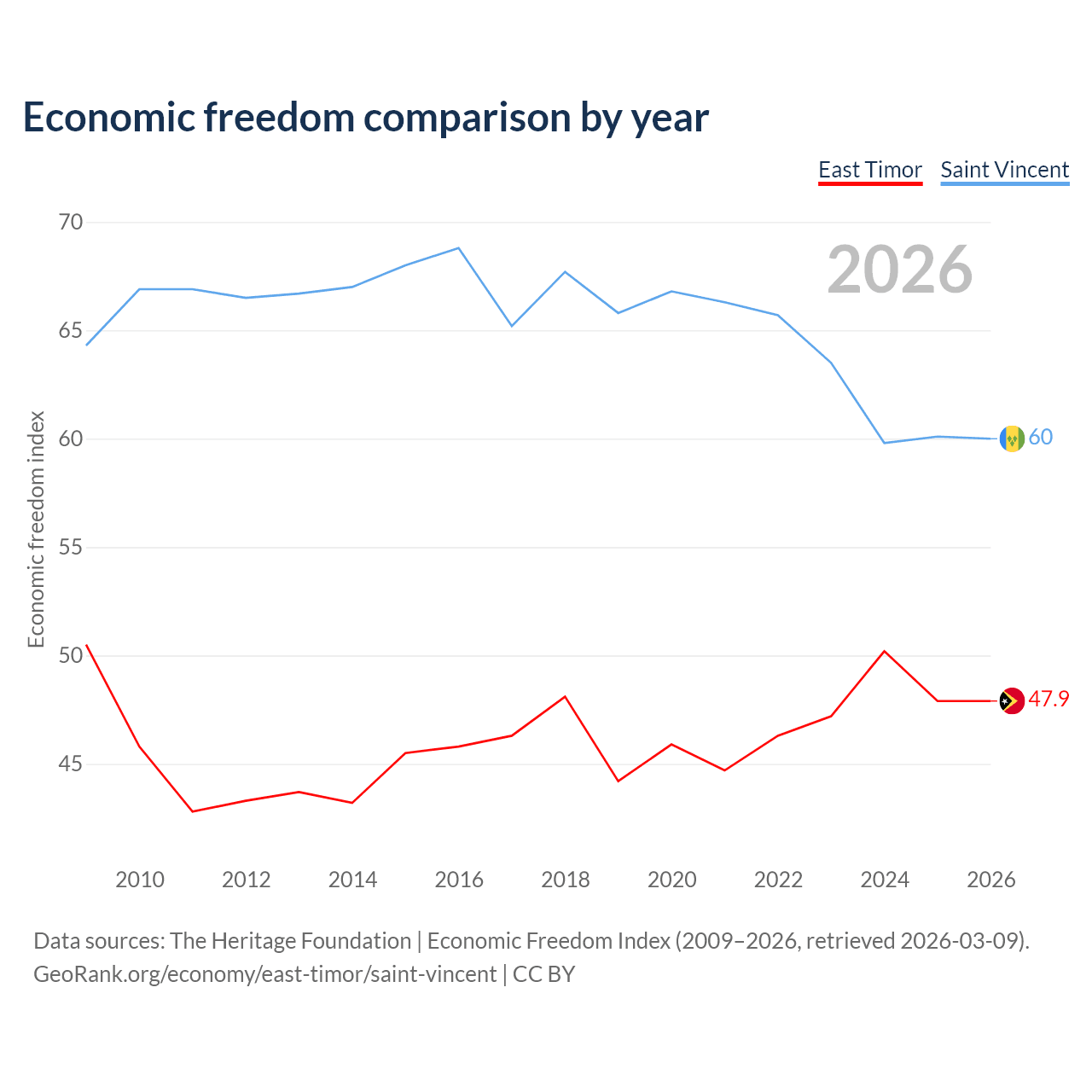 The Economic Freedom Index for East Timor is 47.9, ranking 173/197, compared to 60 for Saint Vincent, ranking 98/197. The chart above displays a comparison of annual changes in economic freedom indexes.