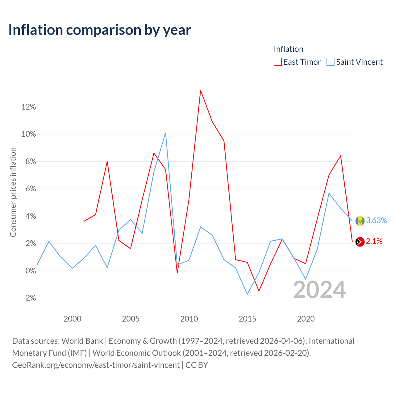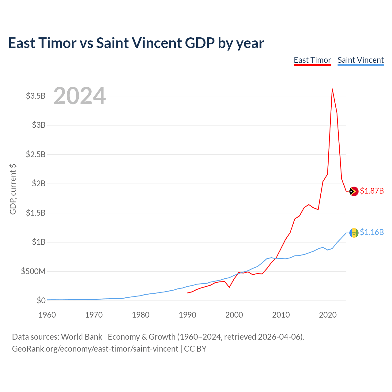 East Timor has a GDP of $1.87B compared to $1.16B for Saint Vincent, ranking 181/197 and 186/197 by economy size, respectively.