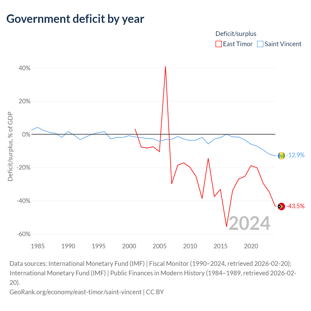 East Timor has $249M in government debt (13.3% of GDP), compared to $1.07B (92.7% of GDP) in Saint Vincent.