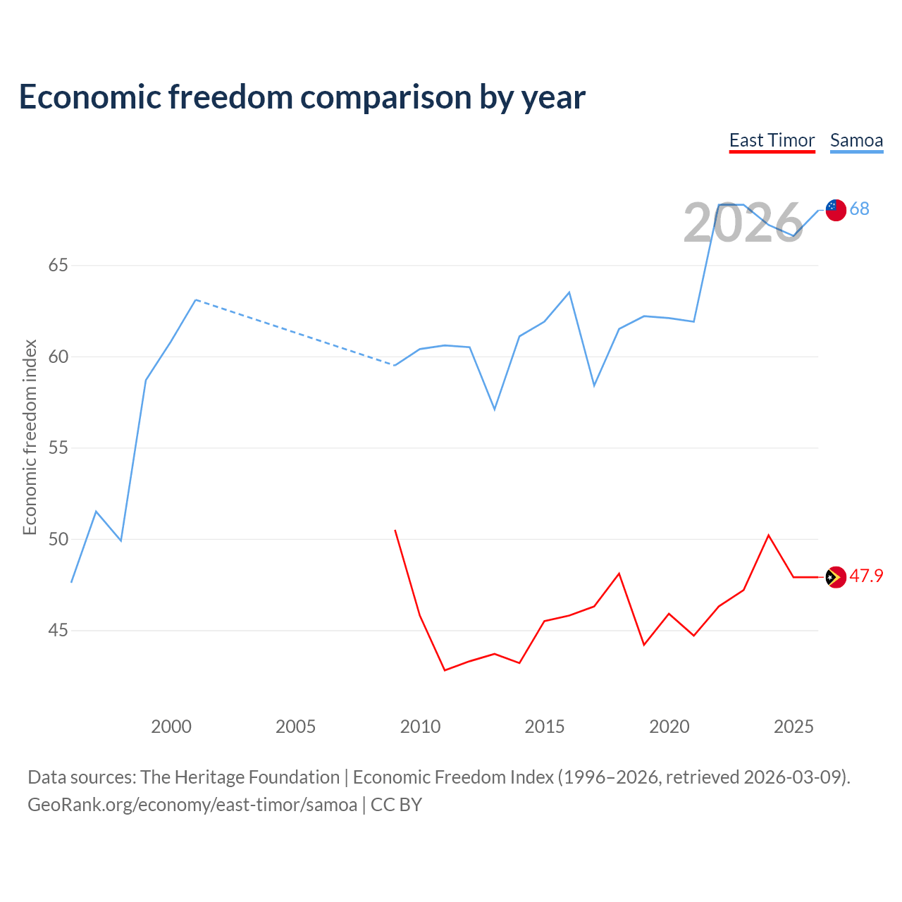 The Economic Freedom Index for East Timor is 47.9, ranking 173/197, compared to 68 for Samoa, ranking 52/197. The chart above displays a comparison of annual changes in economic freedom indexes.