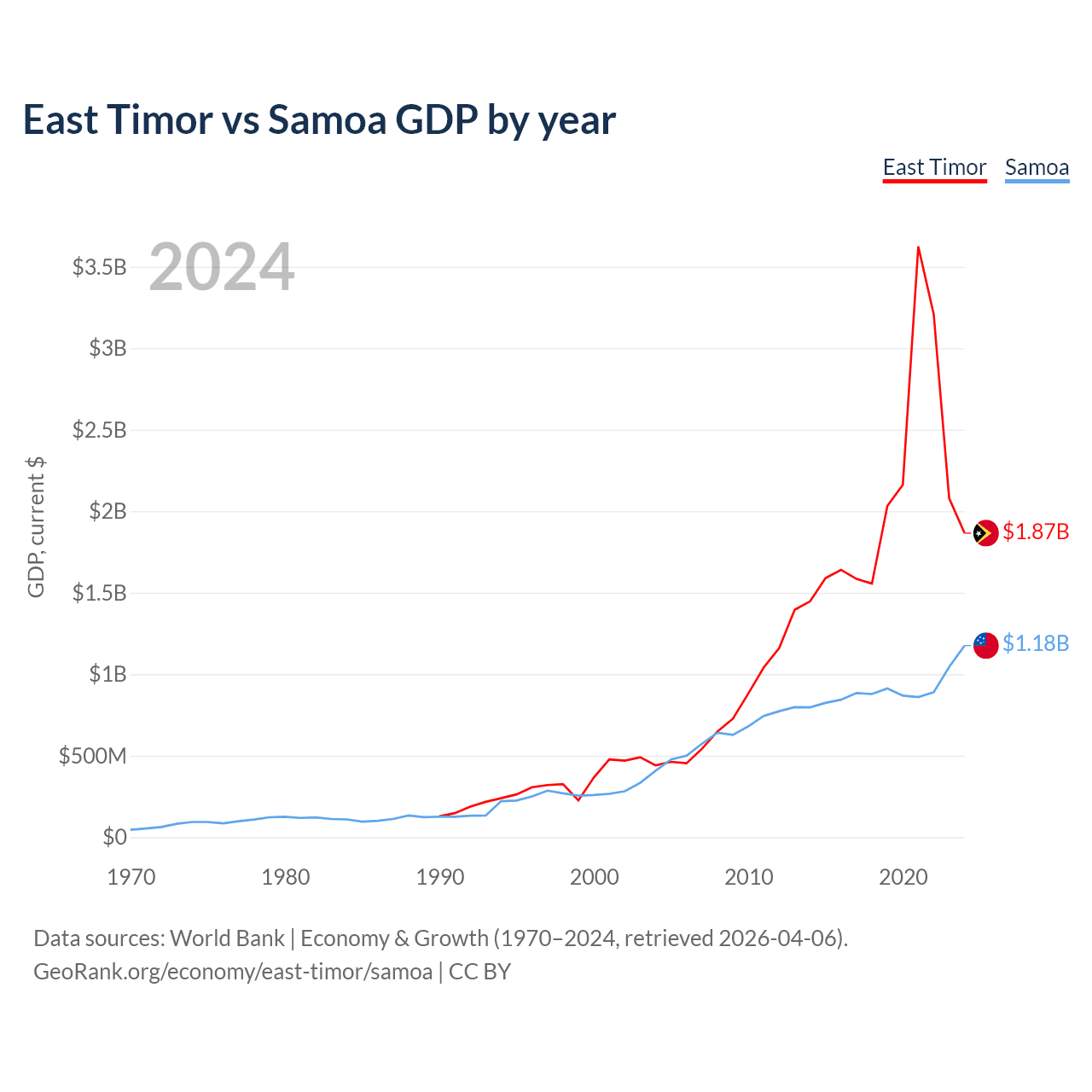 East Timor has a GDP of $1.87B compared to $1.18B for Samoa, ranking 181/197 and 185/197 by economy size, respectively.