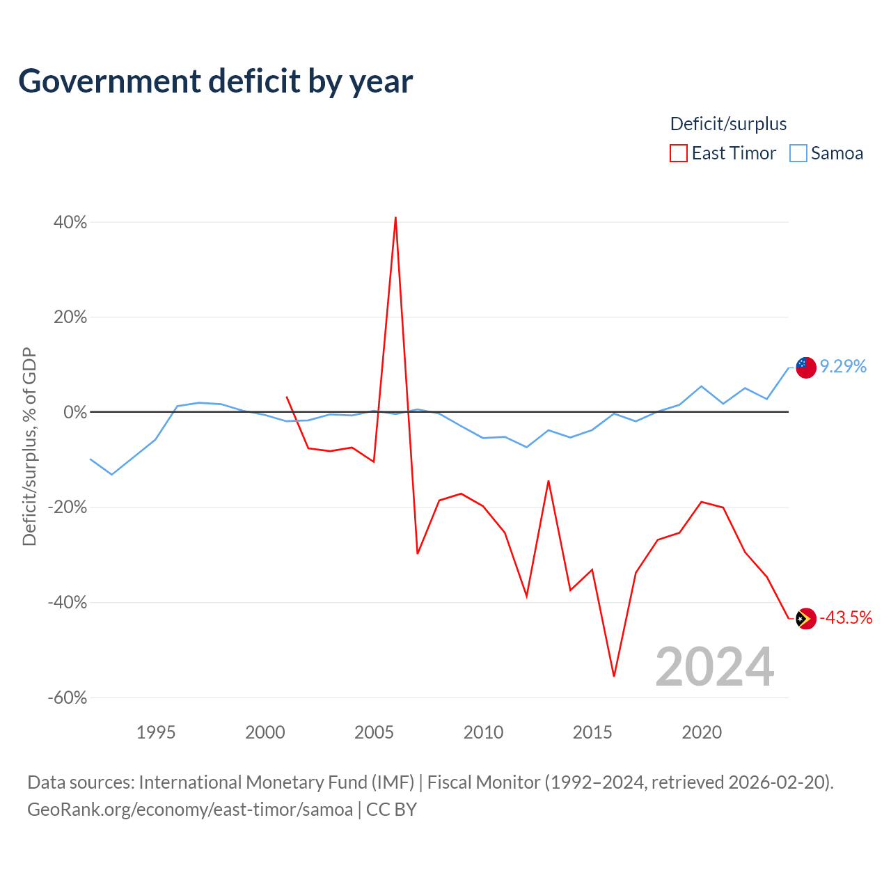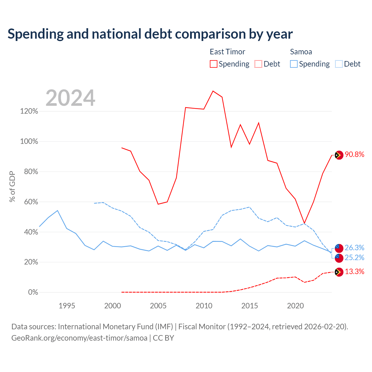 East Timor has $249M in government debt (13.3% of GDP), compared to $296M (25.2% of GDP) in Samoa.