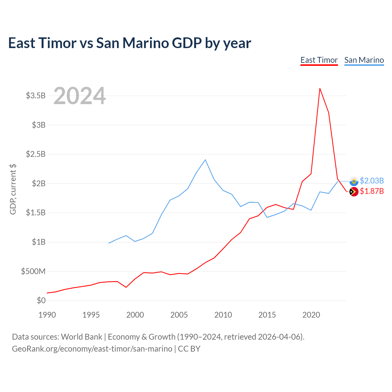 East Timor has a GDP of $1.87B compared to $2.03B for San Marino, ranking 181/197 and 180/197 by economy size, respectively.
